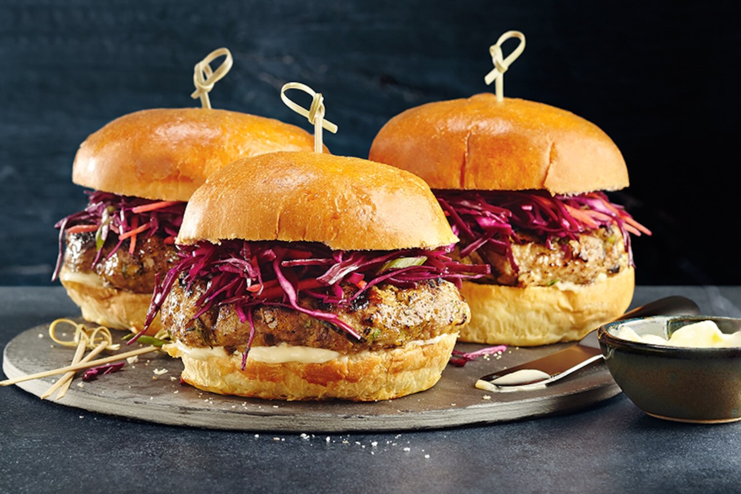 Japanese pork-and-cabbage dumplings, called gyoza, inspired these yummy burgers. The subtle sweetness of brioche or pain au lait buns makes for a perfect pairing, but if you can't find them, substitute with your favourite soft hamburger buns.