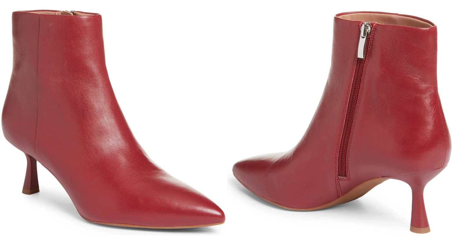 A flared heel and pointy toe add angular intrigue to a minimalist bootie crafted from smooth leather with a side-zip closure.