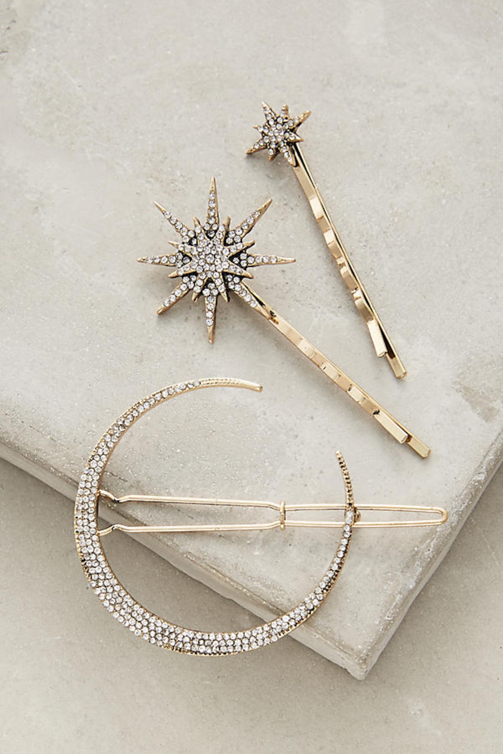 Add a little twinkle do you up do with this celestial duo of rhinestone encrusted star pins and crescent moon barrette.