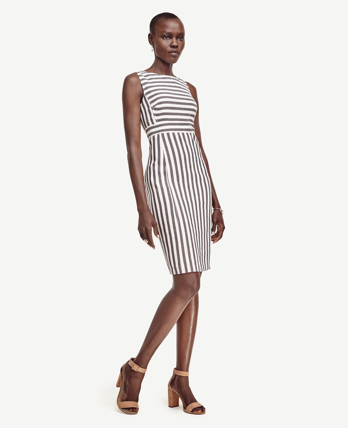 Striped linen blend sheath dress, $185.50, anntaylor.com.