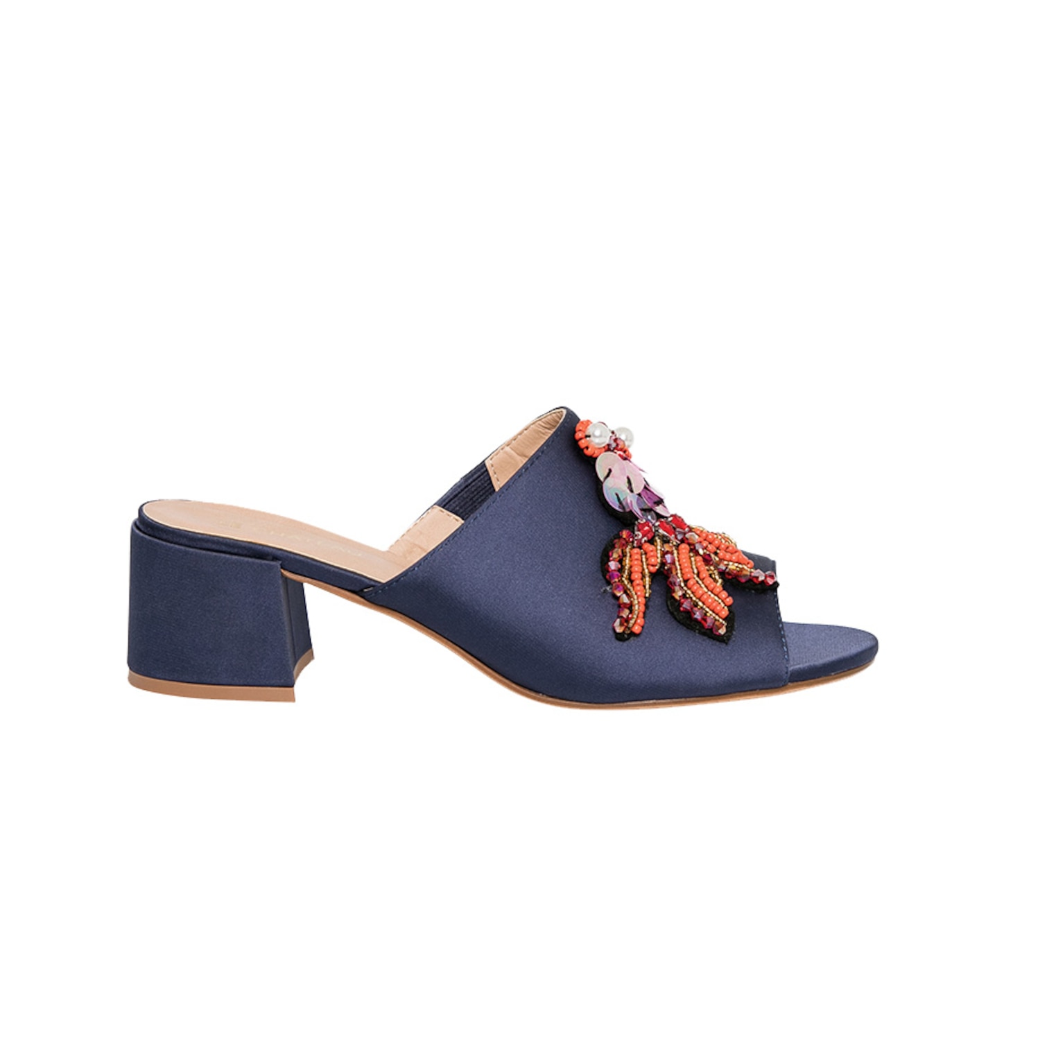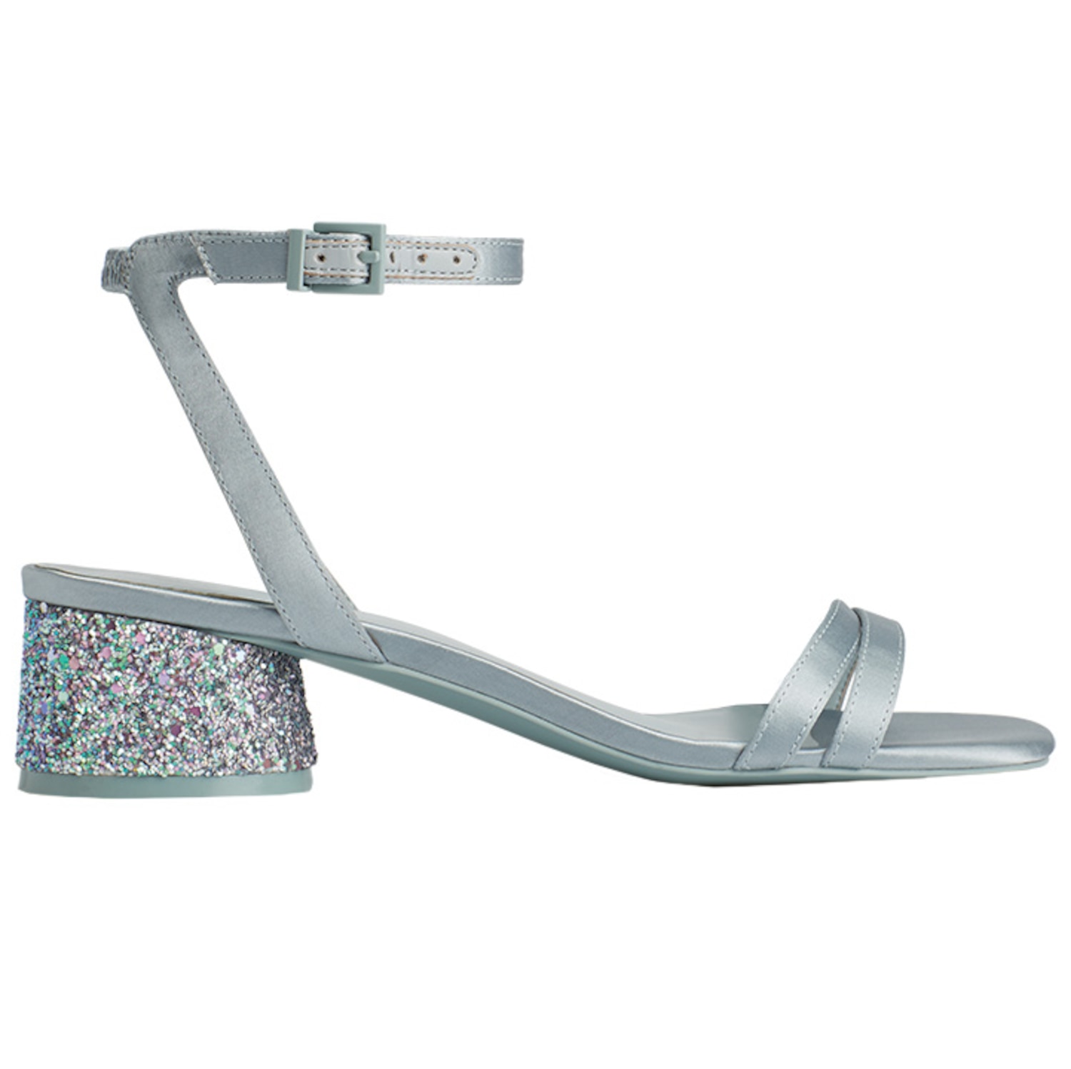 Embellished-satin sandals with block heels, $50, lechateau.com.