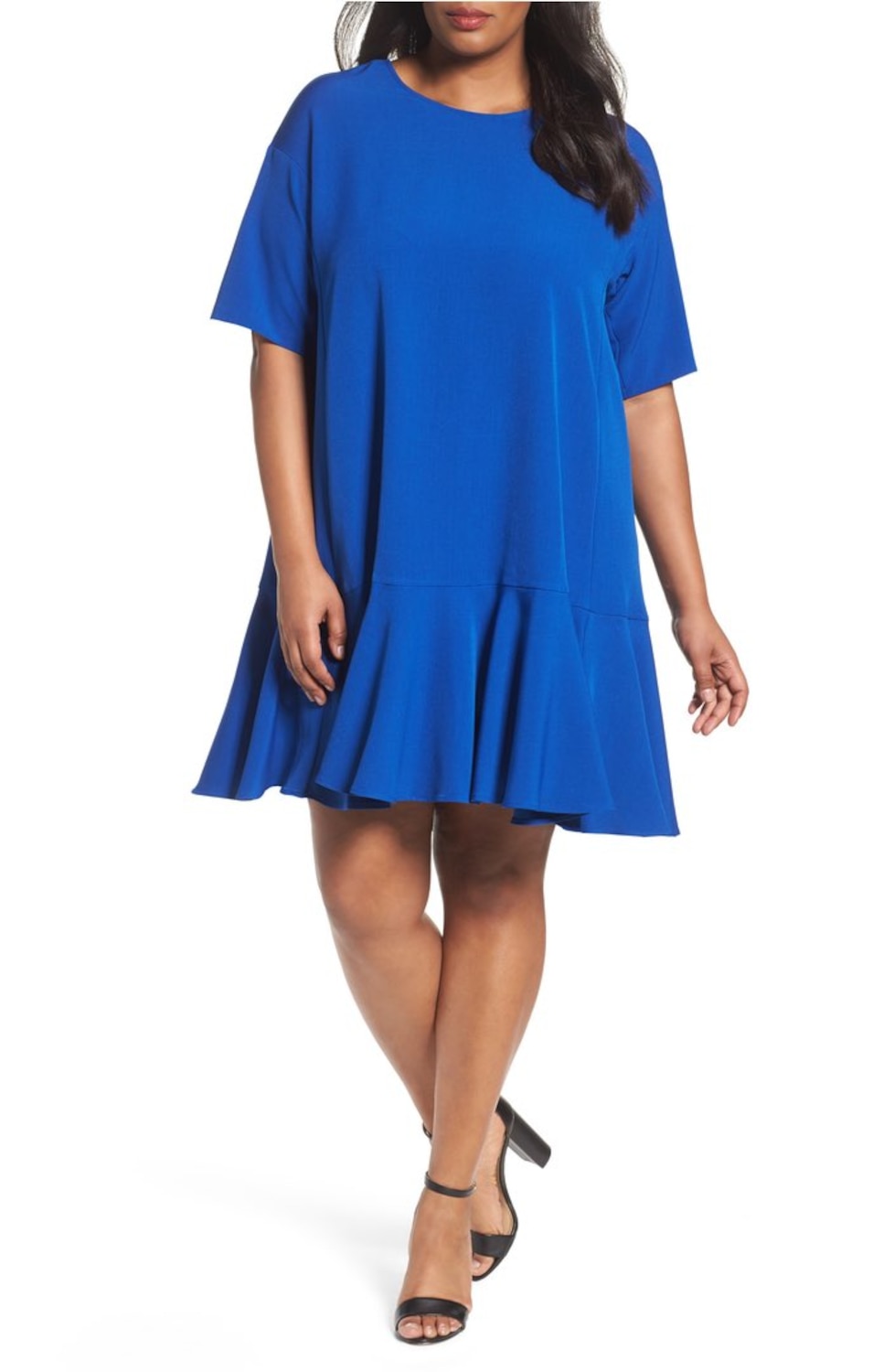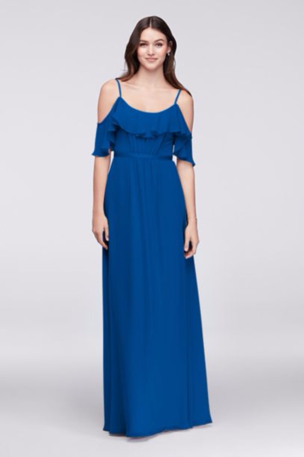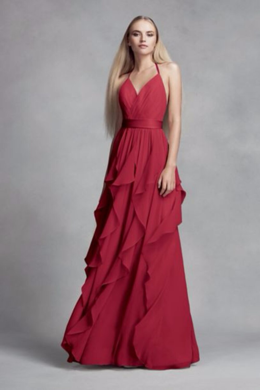 Chiffon dress with ruffle skirt, $200, davidsbridal.com.