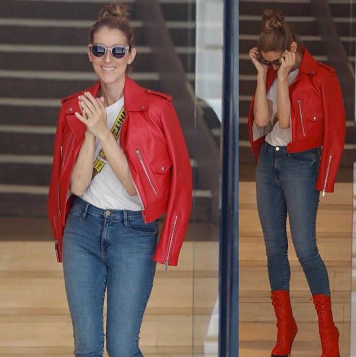 Céline takes the casual jeans and white tee combination to the next level. She embraced colour and wore a bright red leather jacket and pair of boots to match.