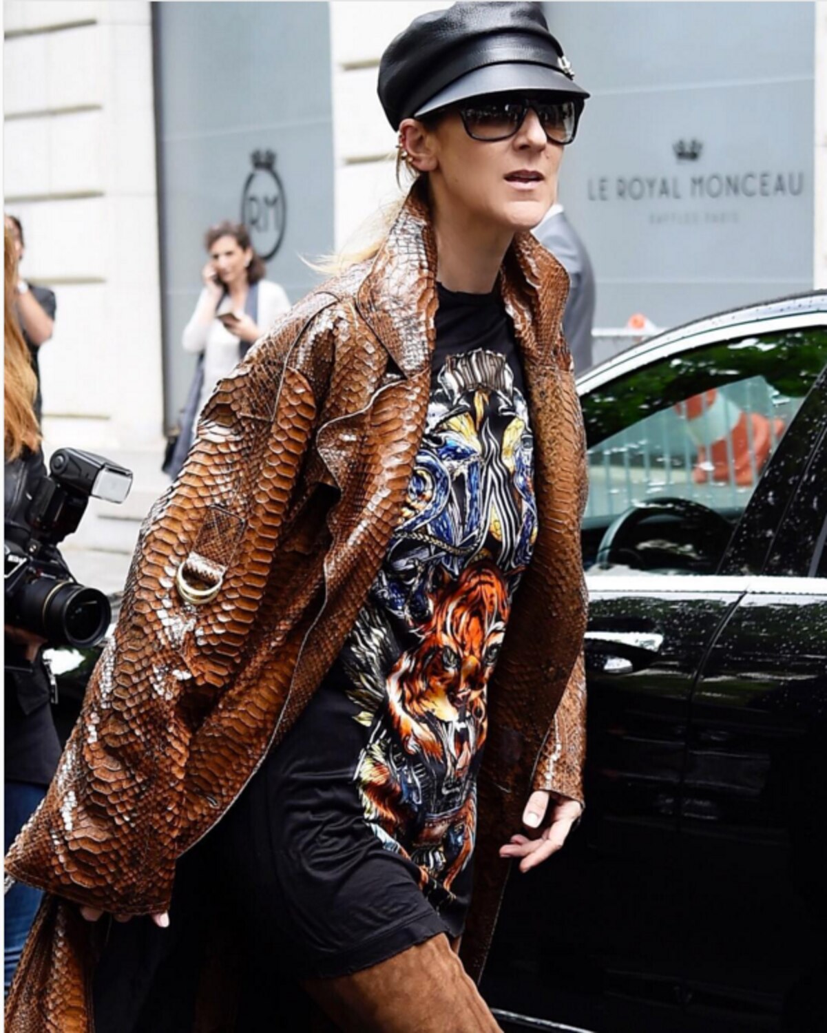 All eyes were on Céline when she wore a head-to-toe snakeskin print out around Paris. Her jacket is by French designer, Rochas and her thigh-high boots are by Balmain. Her matching handbag is from her own upcoming collection, Céline Dion.
