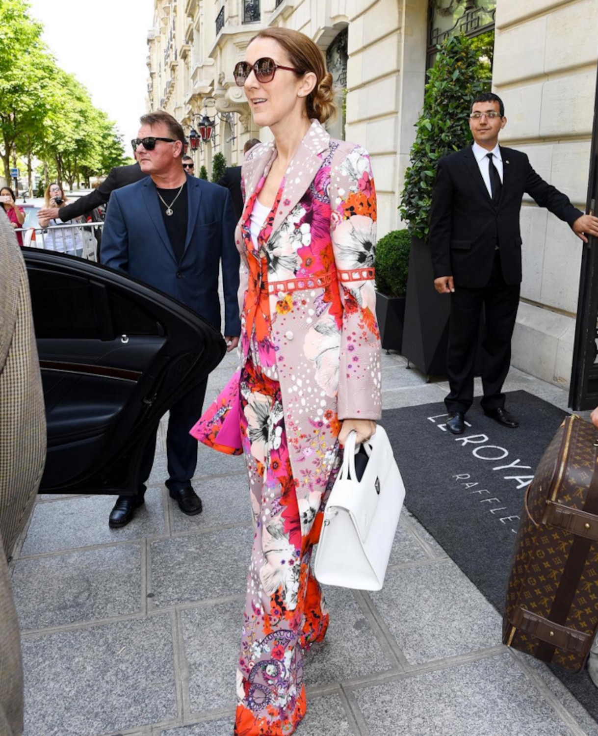 During her press tour in Paris, Céline graced the Parisian streets in a floral Roberto Cavalli "Garden of Eden" suit. She nailed her head-to-toe floral look with her matching overcoat.