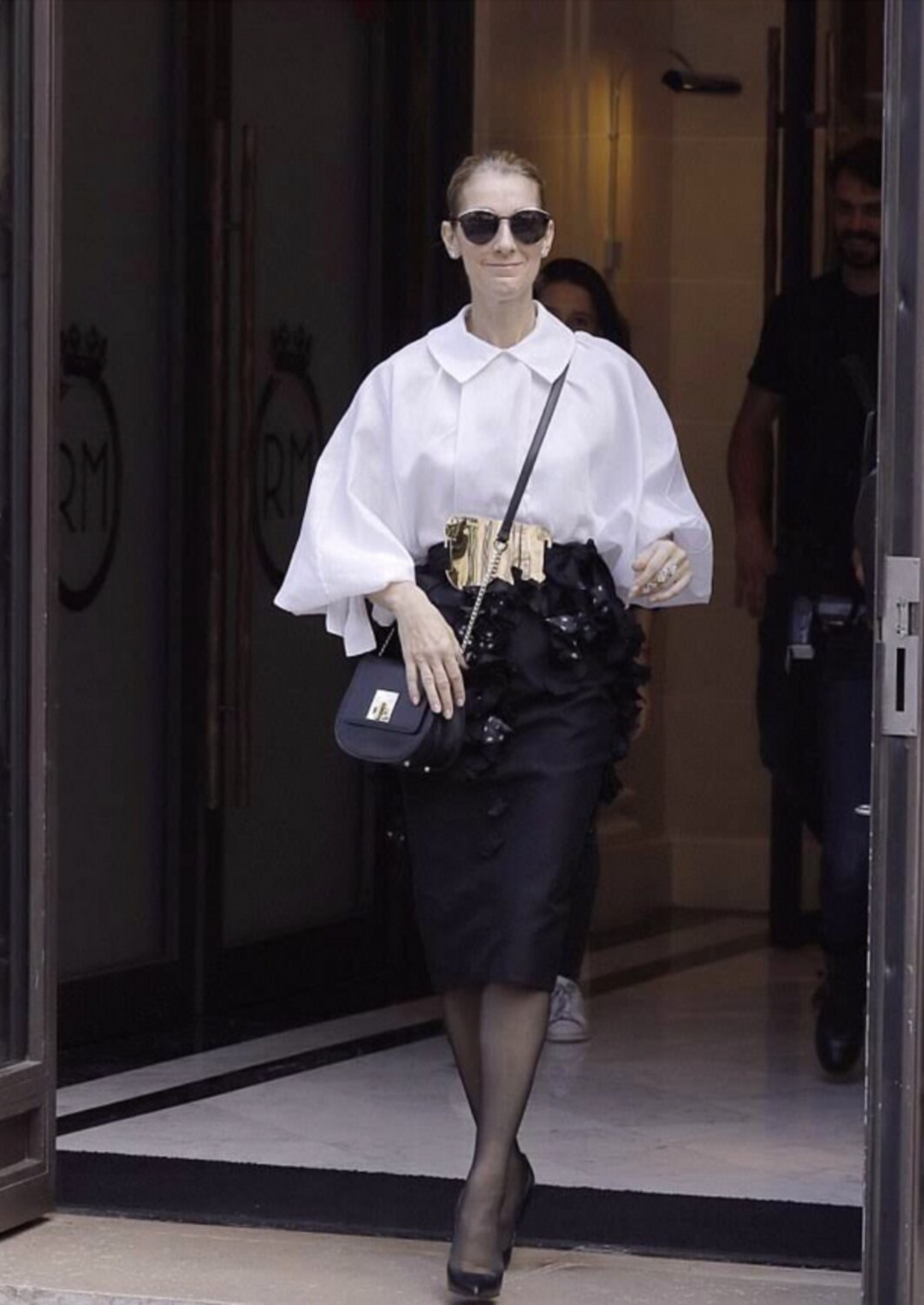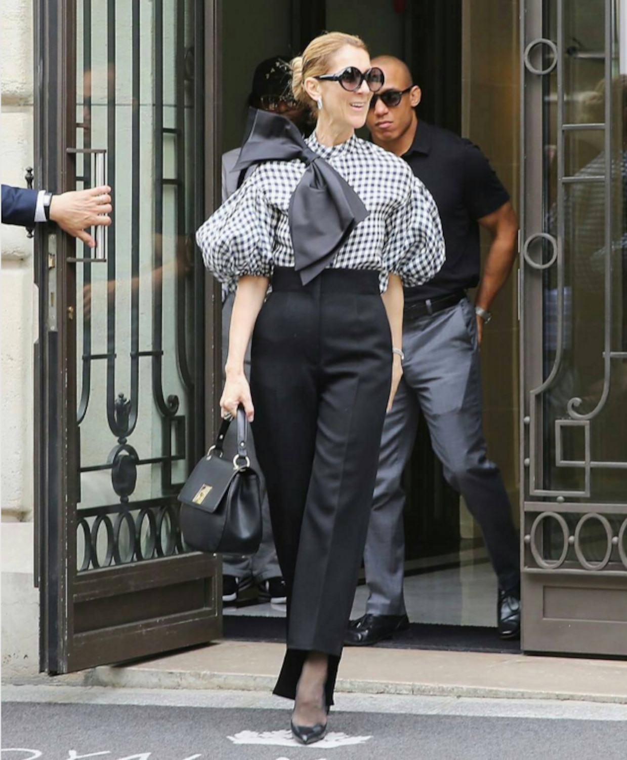 The oversized, puffy sleeves are becoming a Céline Dion signature. The French-Canadian singer was spotted leaving her hotel in a beautiful black and white Dice Kayek top. We love the gigantic bow! Céline complete look included a pair of high-waisted pants and a black bag both by Céline.