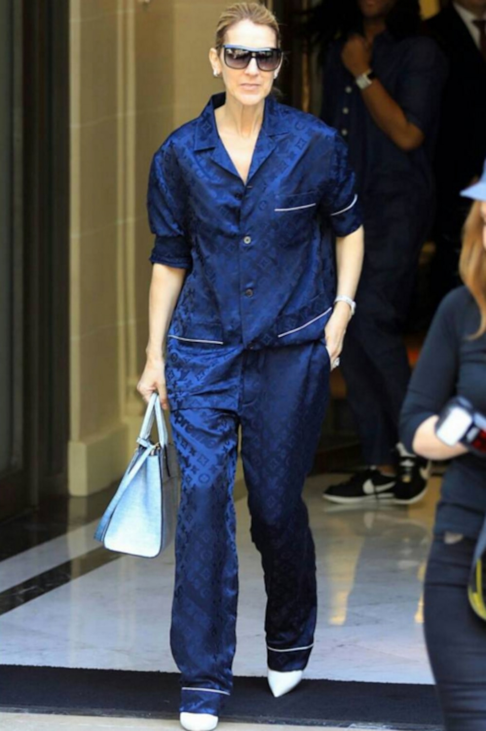 Is there anything she can't wear? Céline was spotted wearing a two-piece Louis Vuitton x Supreme pyjama set and we love it. She styled her luxe pjs with embellished sunglasses and heels.