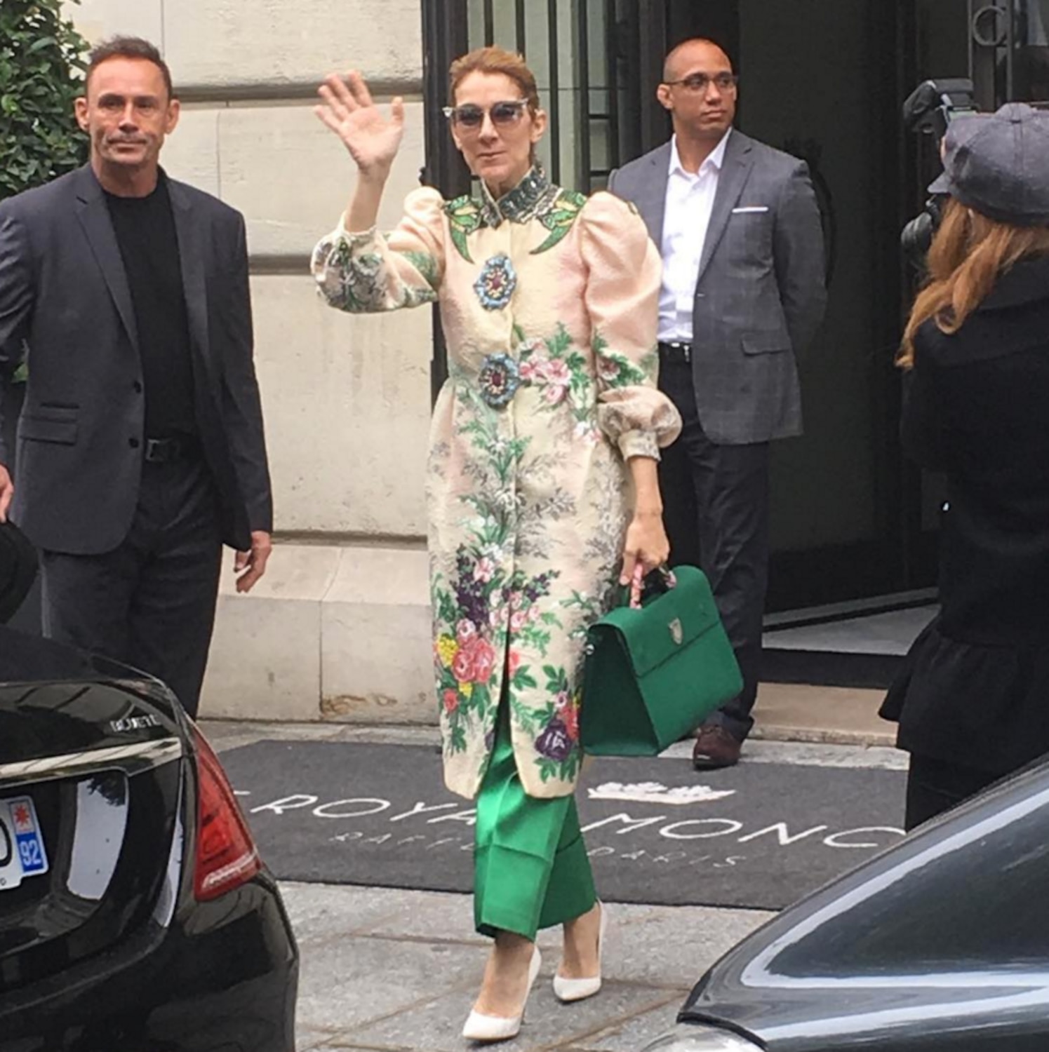 Céline stunned paparazzi when she stepped out of her Paris hotel in a beautiful jacquard weave satin coat by Gucci and a stunning green Dior Diorever handbag to match her satin green pants.