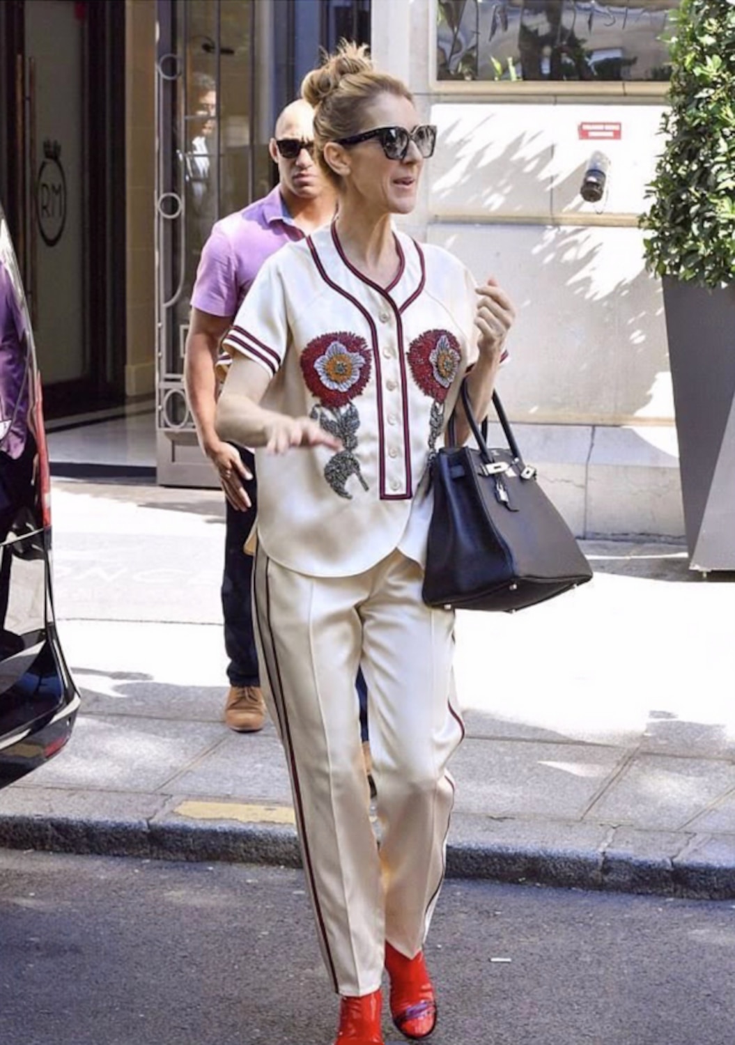 Céline Dion's street style knows no bounds. The French-Canadian singer wore a matching sporty silk button-up shirt and pant combo. She completed her look with a pair of bright red latex booties and black leather bag.