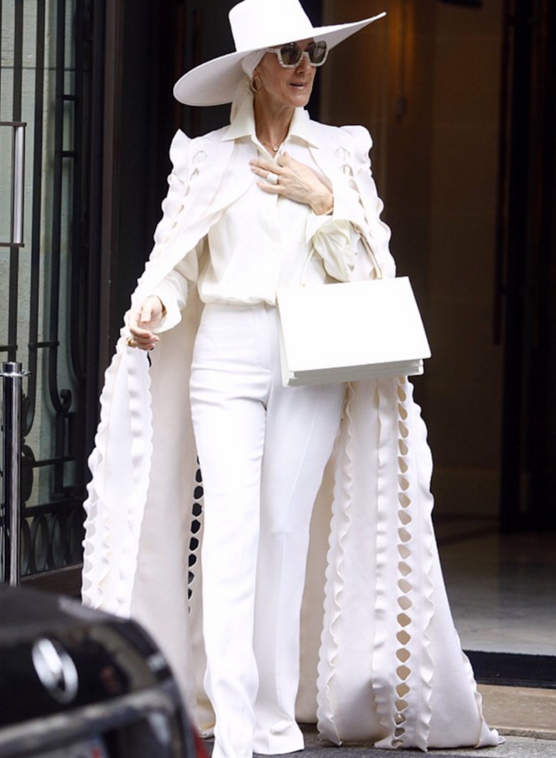 Céline does it again! The French-Canadian singer turned heads in an all-white couture ensemble. Her look consisted of a flowing cape, a blouse, a pair of trousers, and a fedora hat all by Ralph & Russo.