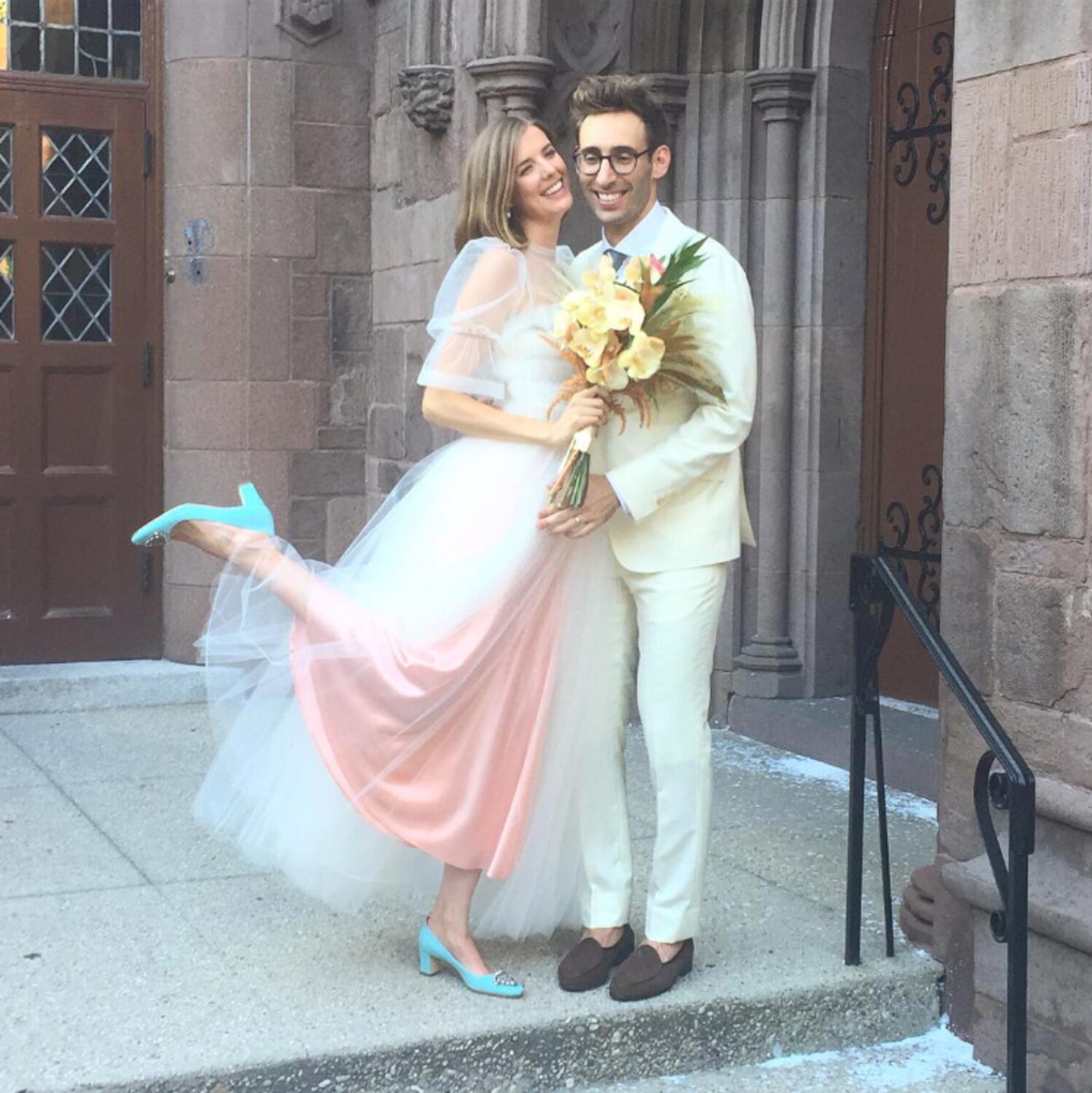 Former model Agyness Deyn married Joel McAndrew in Brooklyn this year. Deyn eschewed tradition in favourite of a midi, pink tulle number by Molly Goddard. Paired with blue shoes, she looks fantastic!
