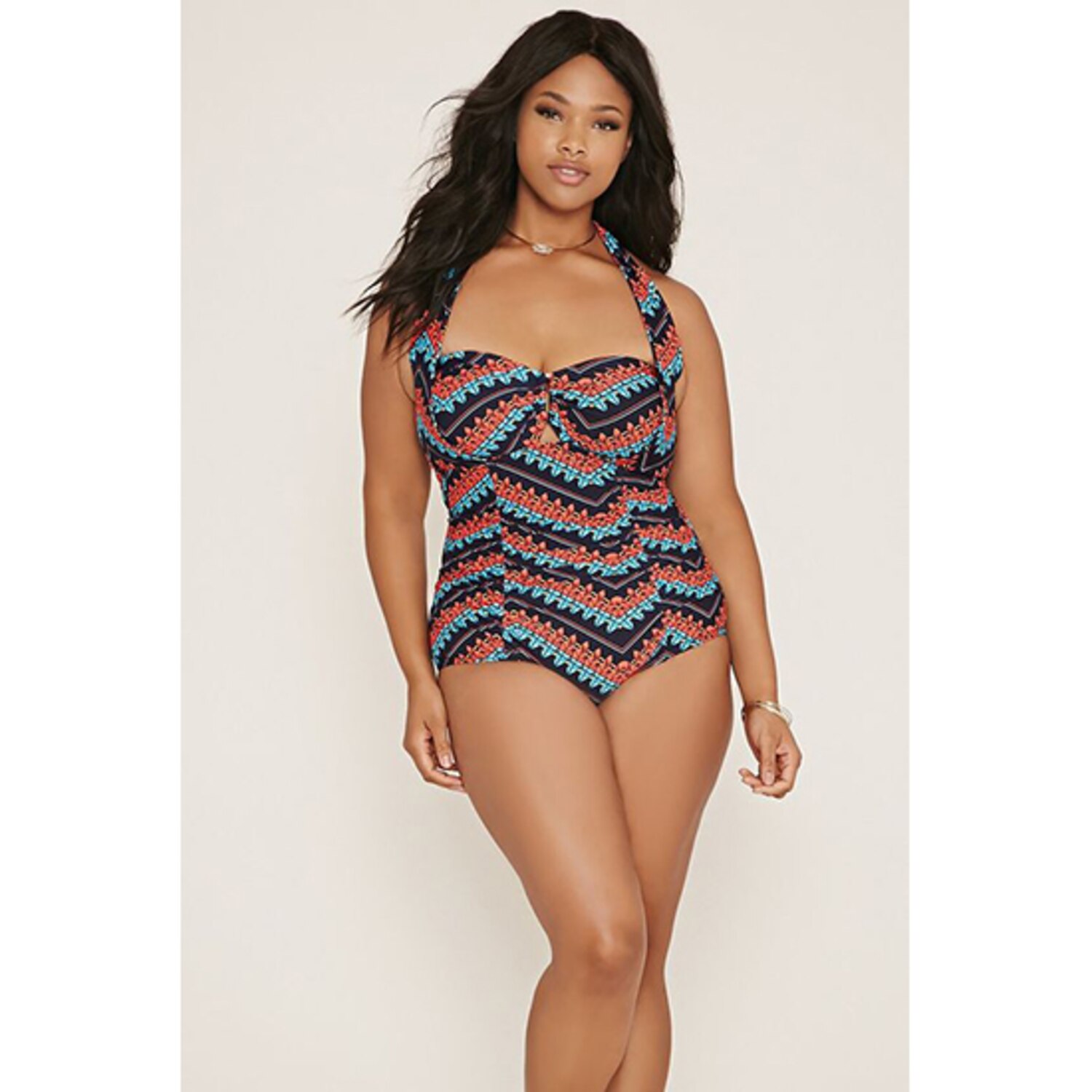 A sweetheart neckline paired with a high-cut leg opening creates a long, lean shape. Plus Size Halter One-Piece, $30, forever21.ca.