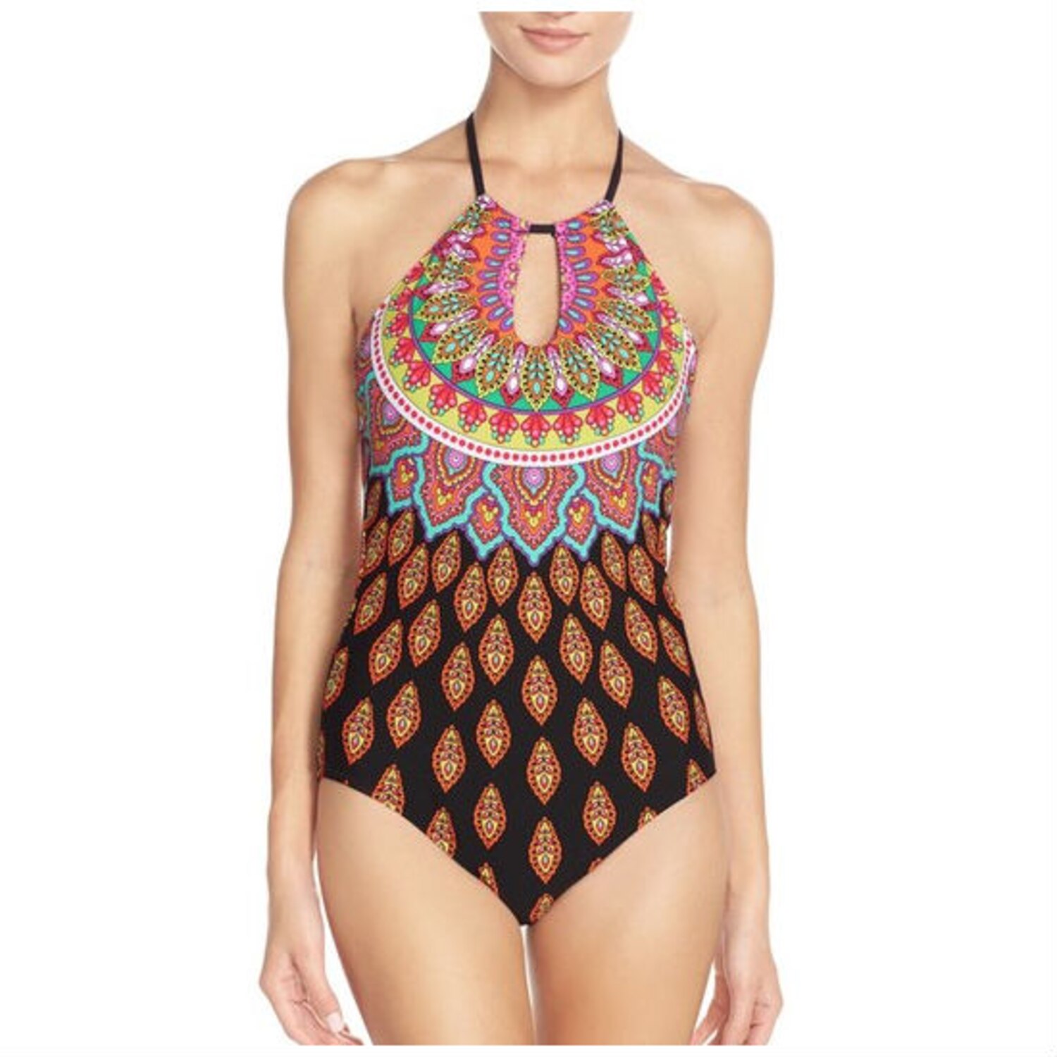 Look for a suit that creates a waist using prints, darker on the bottom the better. Trina Turk Moroccan Medallion print one piece, $114, shop.nordstrom.com.