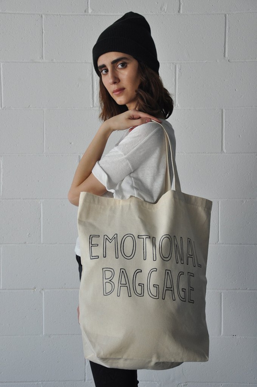 Montreal based artist and owner of Stay Home Club, Gemma Correl, nails it with this witty jumbo sized canvas tote bag. Emotional Baggage tote bag, $26.
