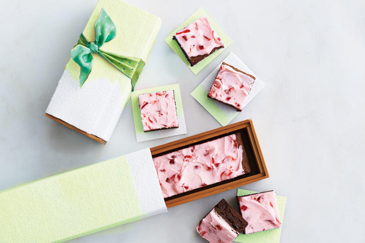 Sweet glacé cherries and vivid pink icing give these sumptuous brownies a nostalgic retro look.