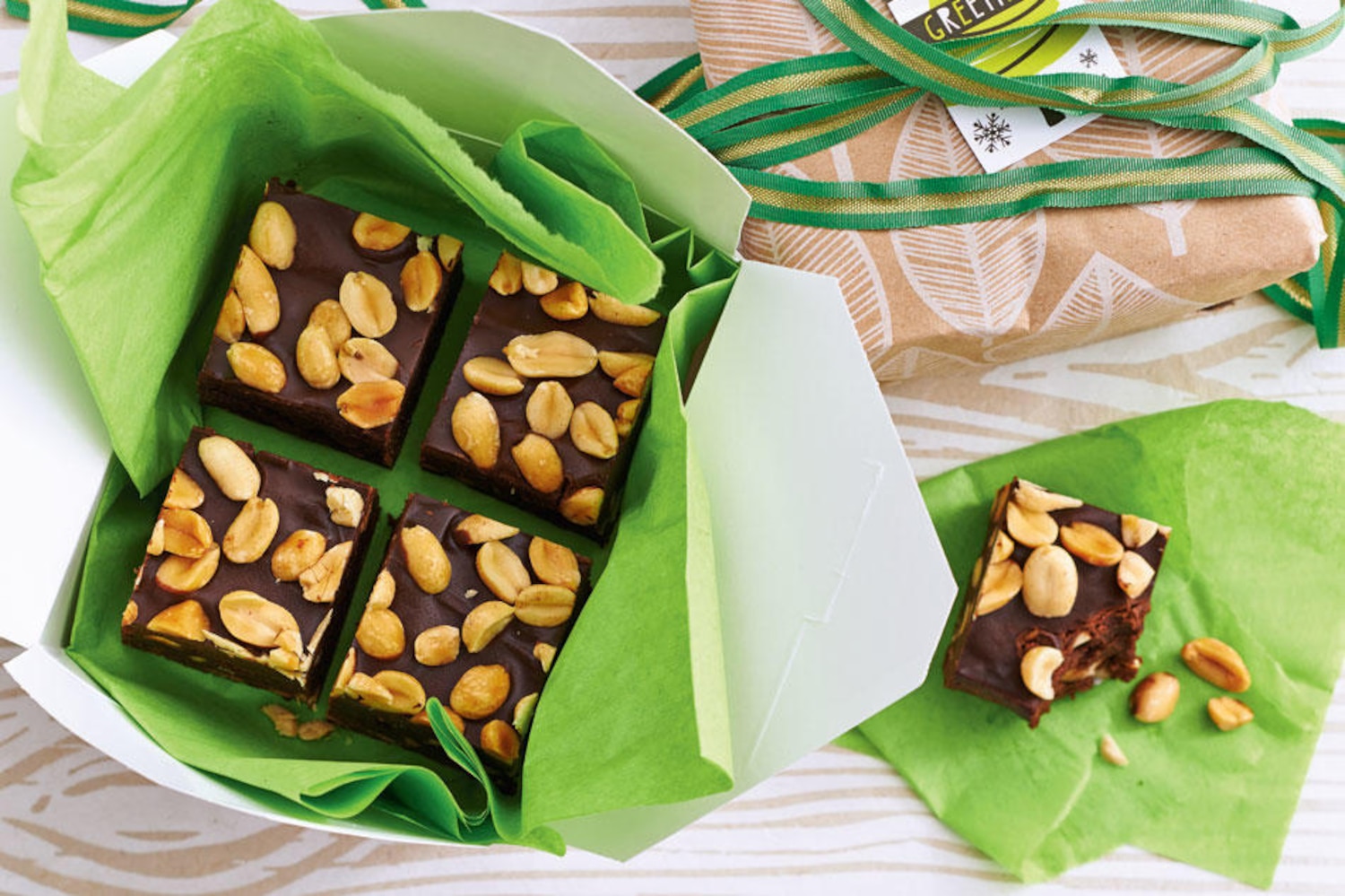 Crunchy peanuts, fudgy chocolate and a smooth ganache topping—what more could you ask for in a brownie?