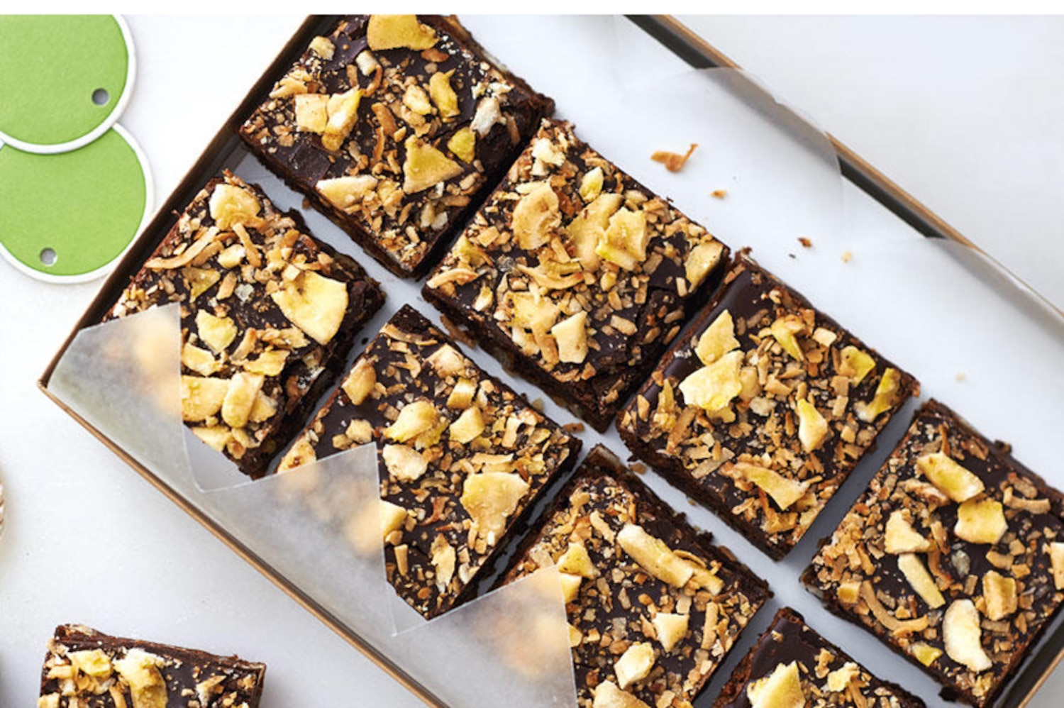 Chopped banana chips and toasted coconut flakes make these dark, fudgy brownies extra special.