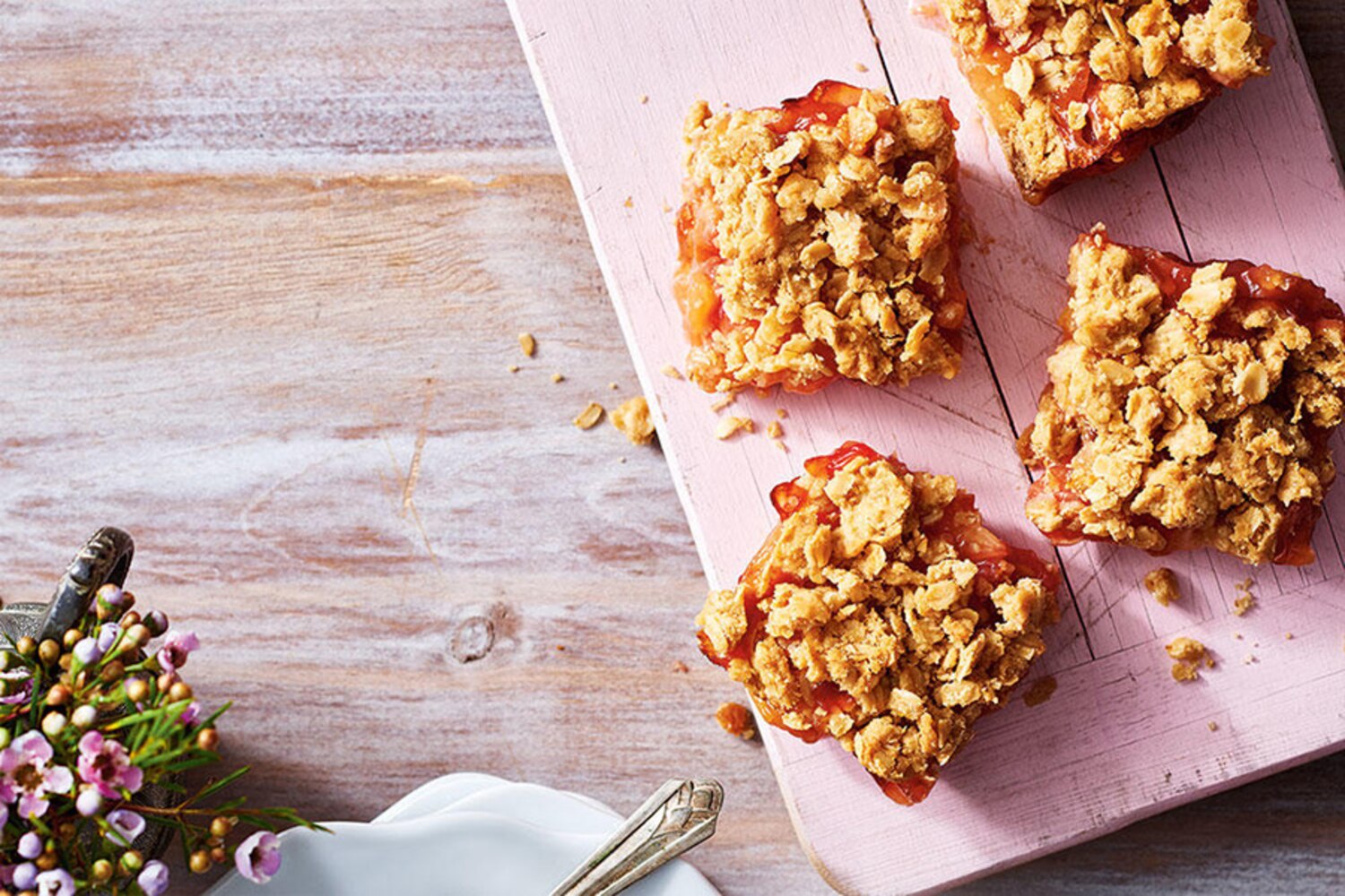 Classic date squares have been reimagined in this dessert featuring a sweet and sticky plum filling.