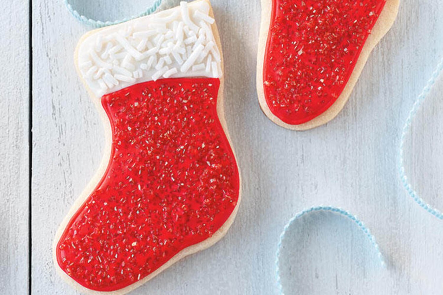 White sprinkles give these stockings a fluffy-trim effect, but feel free to customize them instead: simply tint some of the icing black and use it to write names on the white icing.