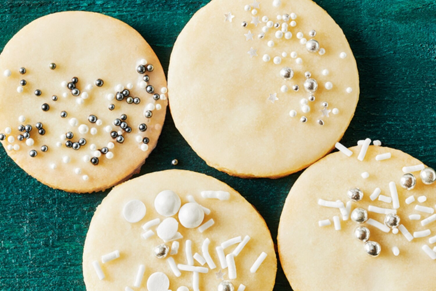 We’ve made brown sugar cookies even more scrumptious by adding a glaze and decorating them with candy sprinkles and dragées.