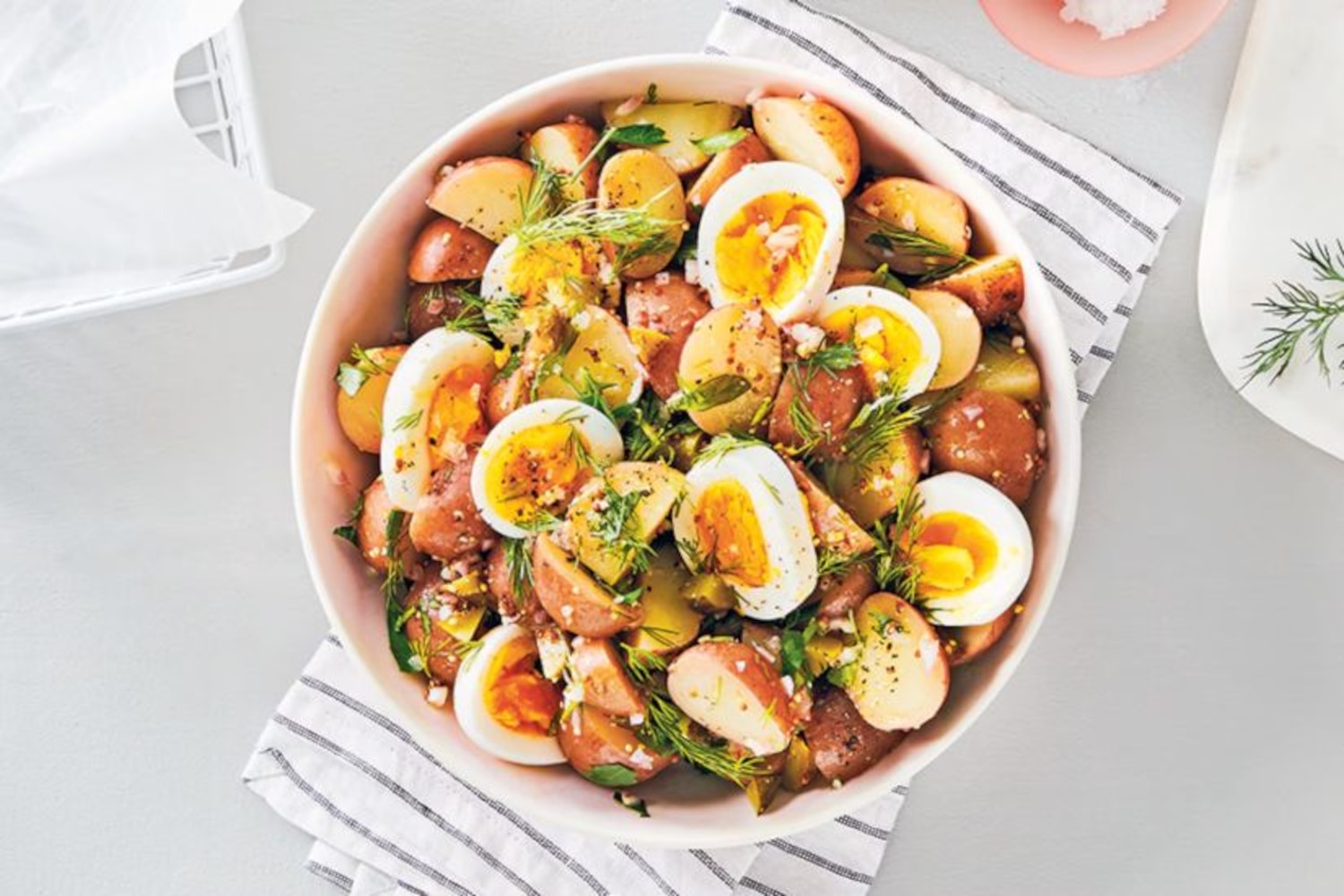 This lightened-up potato salad is dressed with a flavourful mustard-based vinaigrette instead of mayonnaise. Mixed with flaked salmon and topped with eggs, it's wonderful warm but just as good as a cold lunch the next day.