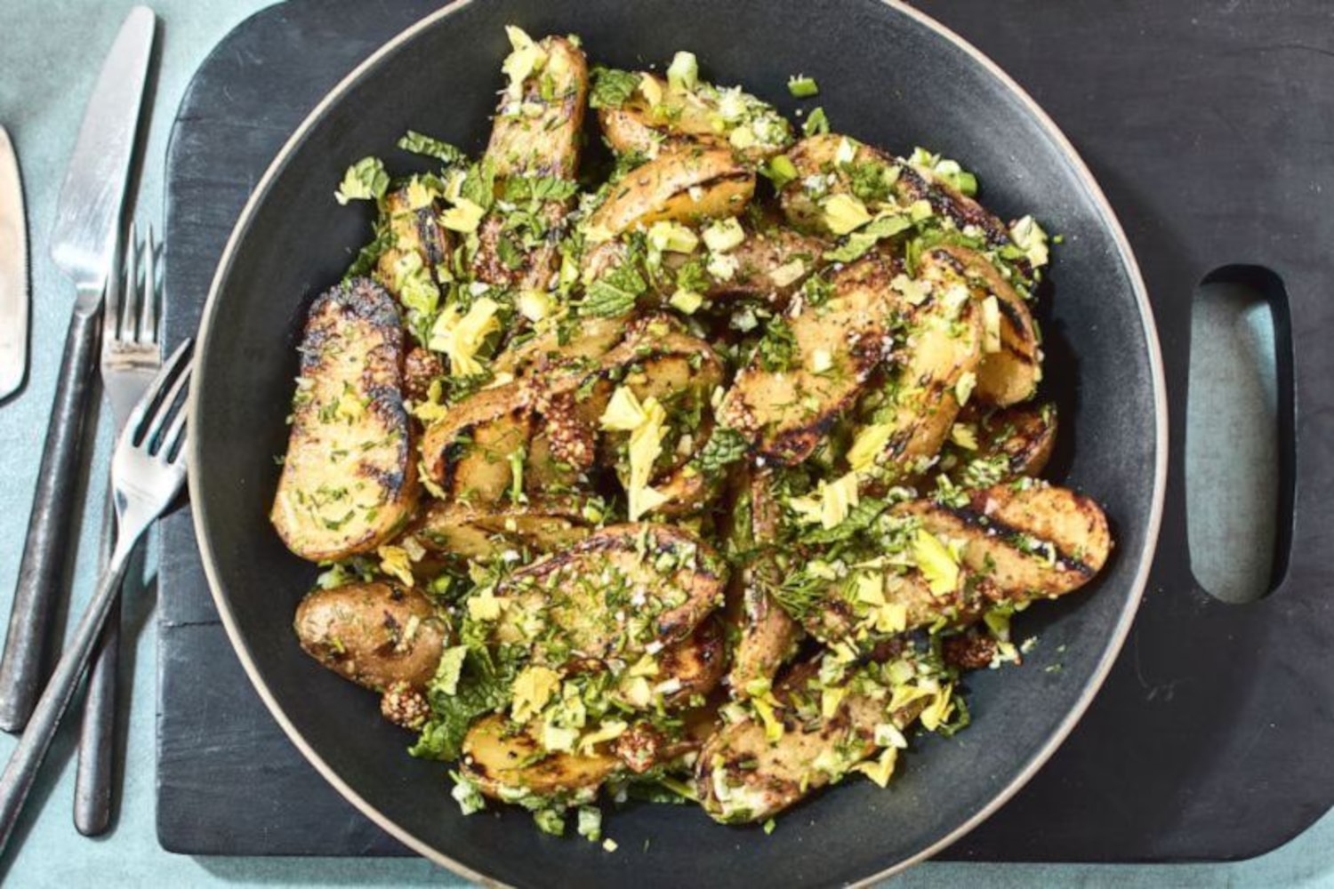 Charred grilled potatoes are topped with a zesty creamy lemon vinaigrette.