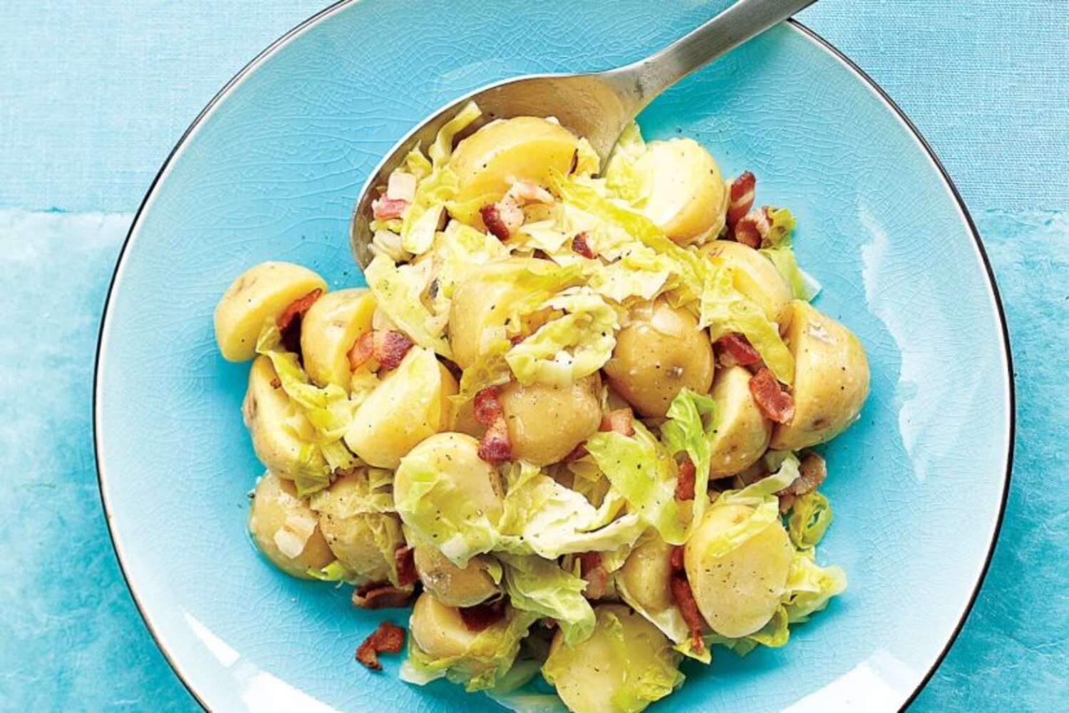 This take on hot German potato salad is sure to be a hit with potato lovers of all ages. For picky palates, you can omit the cabbage, but the warm, salty, sweet bacon dressing makes this unique side dish a crowd-pleaser.