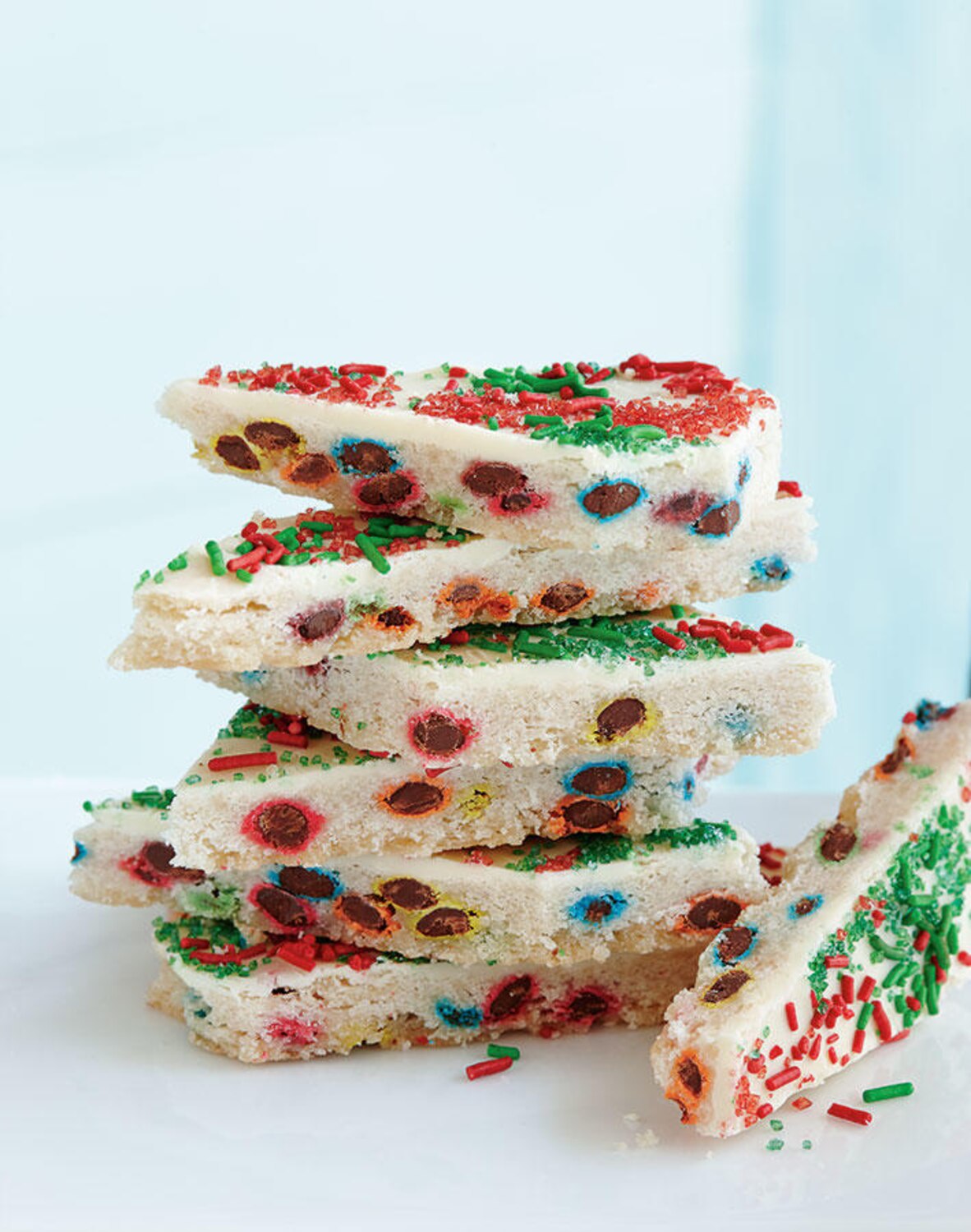 Loaded with chocolate candies, white chocolate and festive sprinkles, these crispy bark-like cookies are bursting with holiday cheer.