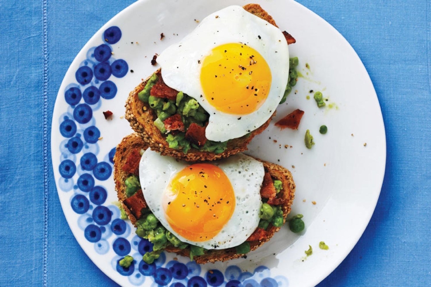 Pea and Bacon Crostini With Fried Eggs