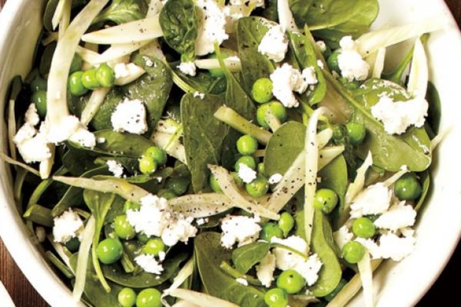 This simple but absolutely delicious salad makes great use of freshly shelled peas and baby spinach. Feel free to substitute whatever baby greens appear in your CSA box for the spinach. Out of season, use frozen peas in place of the fresh and cook until tender-crisp.