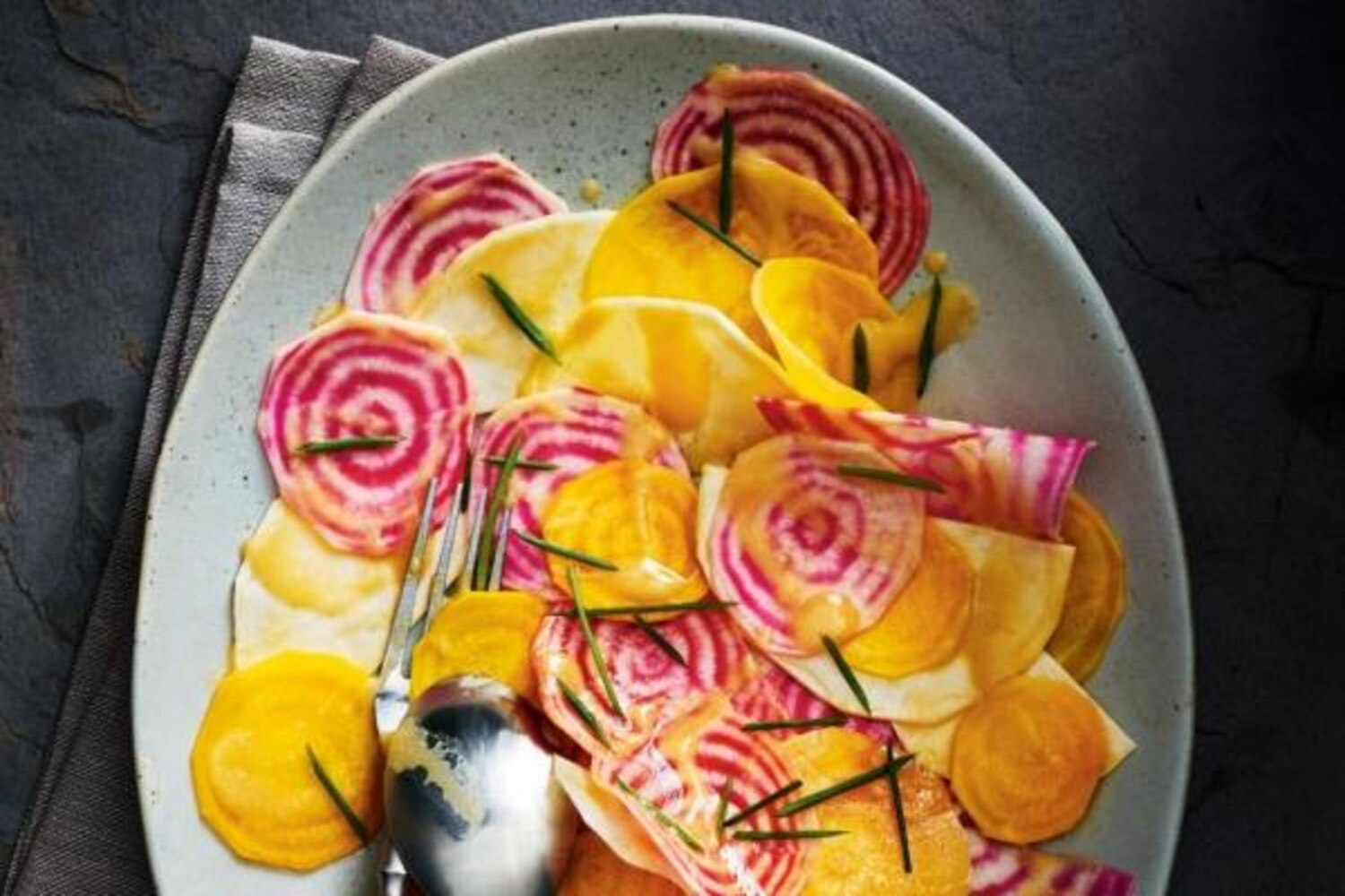 For this stunning salad, use the thinnest setting on your mandoline to shave crisp root vegetables into delicate medallions. Miso paste is generally used to flavour soups, but here it acts as a savoury base for the simple Japanese-inspired dressing.