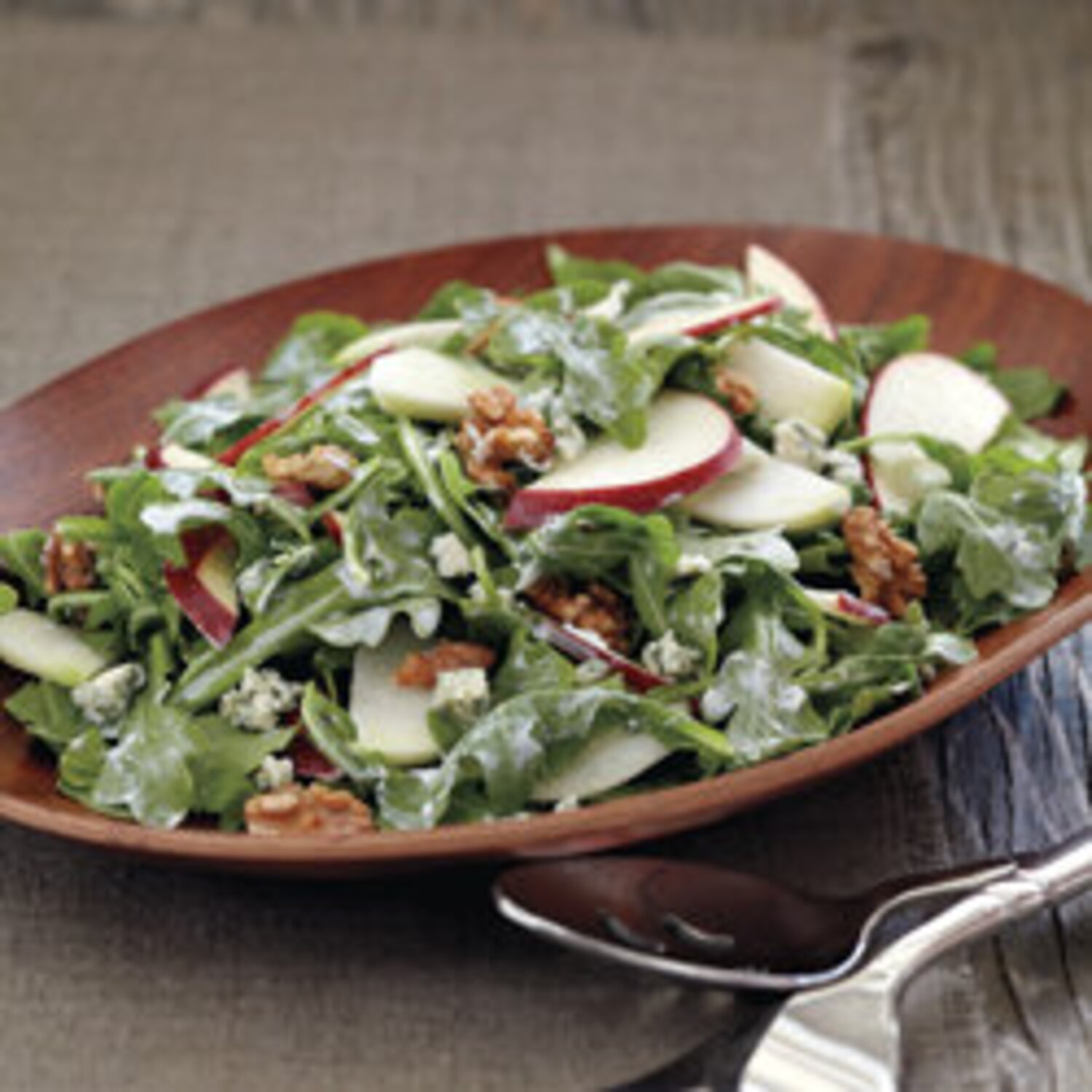 Toasted walnuts, tangy blue cheese and crisp kohlrabi converge in this simple autumn salad. A slightly spicy, creamy dressing is the perfect balance to the peppery arugula.