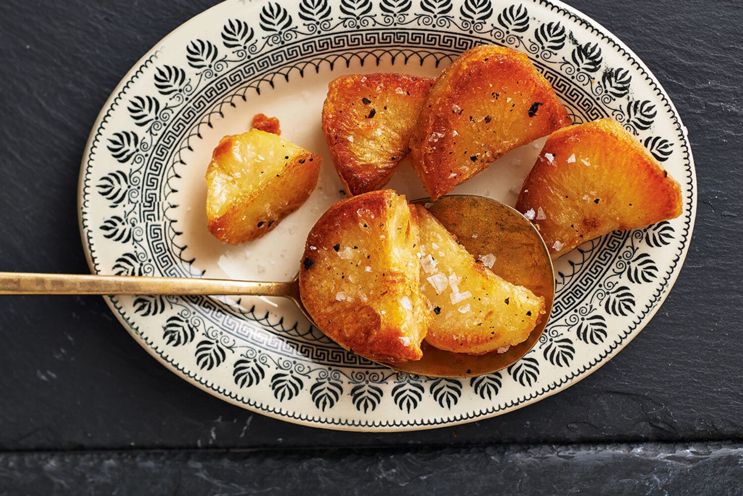 The secret to these crispy roasted potatoes is a dual cooking method—you simmer them first, then finish them off in the oven with goose, duck or beef fat. Look for the fat in the gourmet section of major supermarkets or in specialty markets, or simply reserve the drippings from cooking duck, goose or beef.