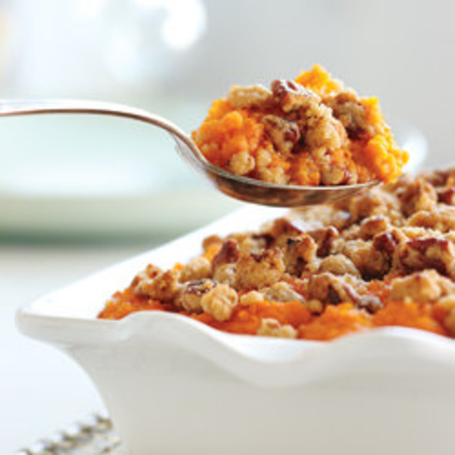 Sweet potato casserole is a must on holiday tables in the United States, but the traditional marshmallow-topped side doesn’t always have the same appeal here in Canada. For our Canadian twist on this dish, we’ve swapped out the marshmallows for a crunchy pecan and brown sugar streusel that’s the perfect balance of sweet and savoury.