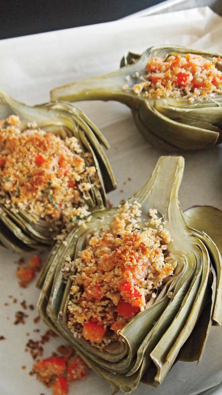 Artichokes may seem intimidating, but they’re actually quite simple to prepare. To prep them, first cut off the sharp tips of the leaves, then slice off the top of the artichoke to remove the fuzzy centre. Simmering in water loosens the remaining tough leaves, making them a cinch to pull off. It’s best to do this work a day ahead so that all you have to do the day of the meal is make the topping and roast the artichokes until crispy. The show-stopping end result is well worth the effort.