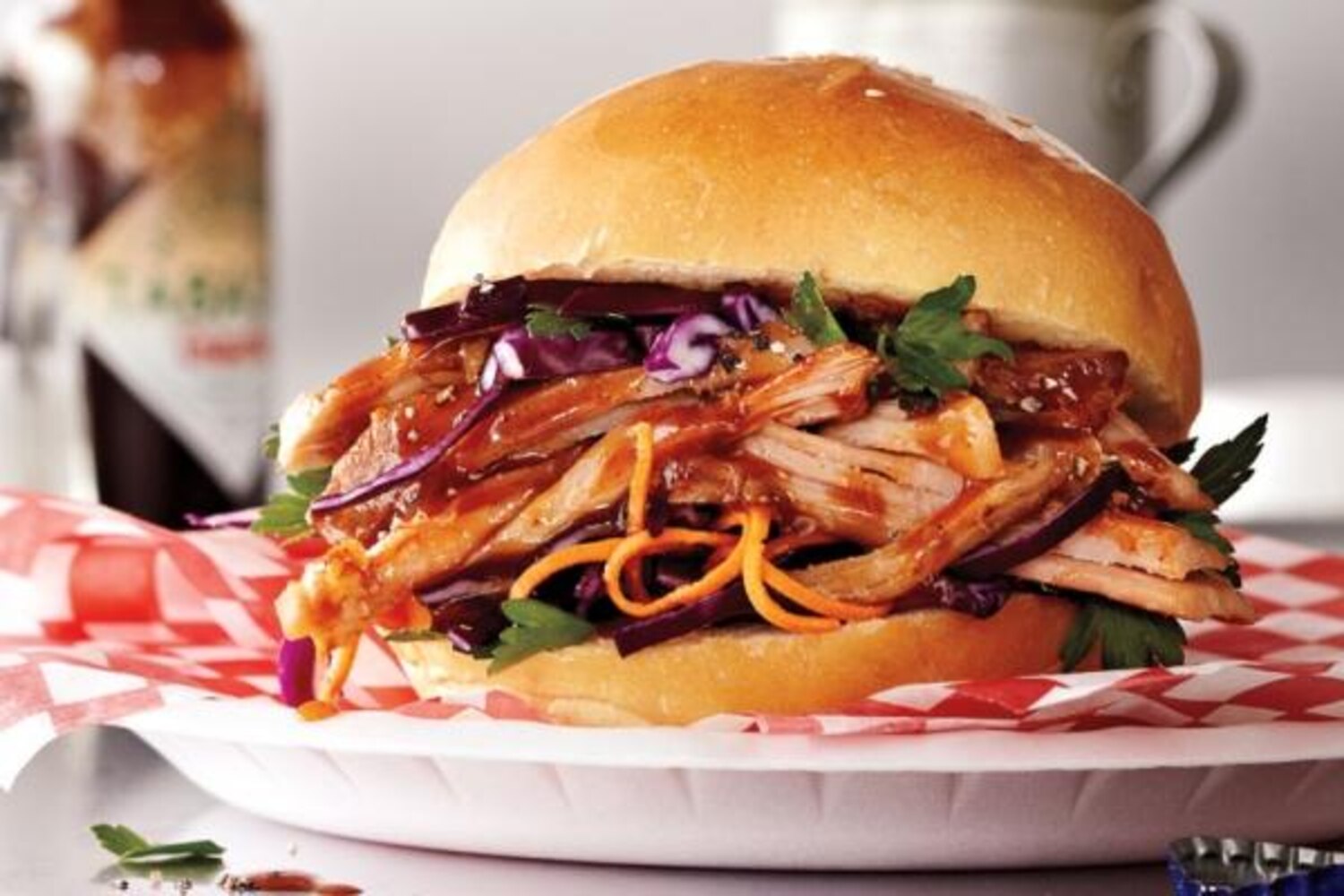 Pulled pork is dead easy to make, but you do need to carve out a couple hours in your schedule to cook the meat. Serve piled high on buns, with bowls of garnishes, such as pickled jalapeños, sour cream, shredded cheese and thinly shredded red cabbage.