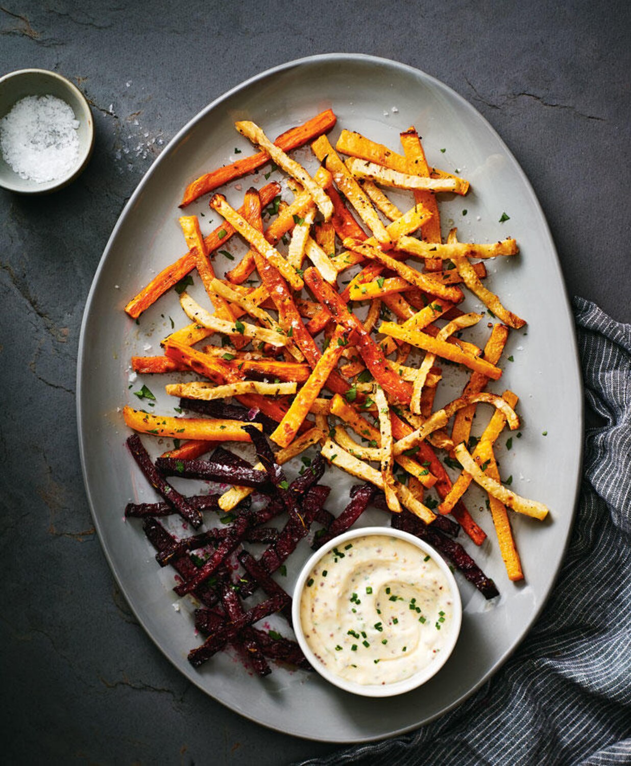 Get the recipe: Rainbow Root Fries with Chive Mayo