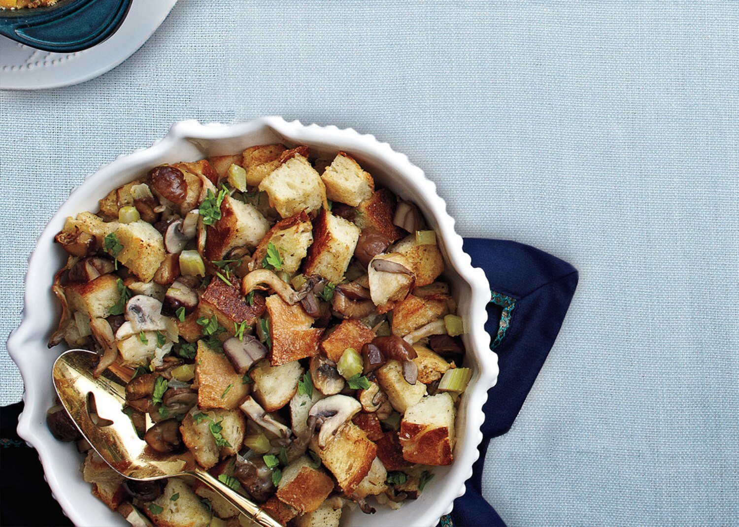 Sweet chestnuts and meaty mushrooms add fall flavour to an otherwise classic stuffing. Look for ready-to-eat peeled whole chestnuts in the grocery store.