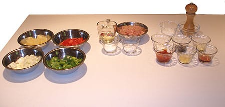 - 1 each onion and sweet red and green pepper, cut into 3/4-inch (2 cm) cubes