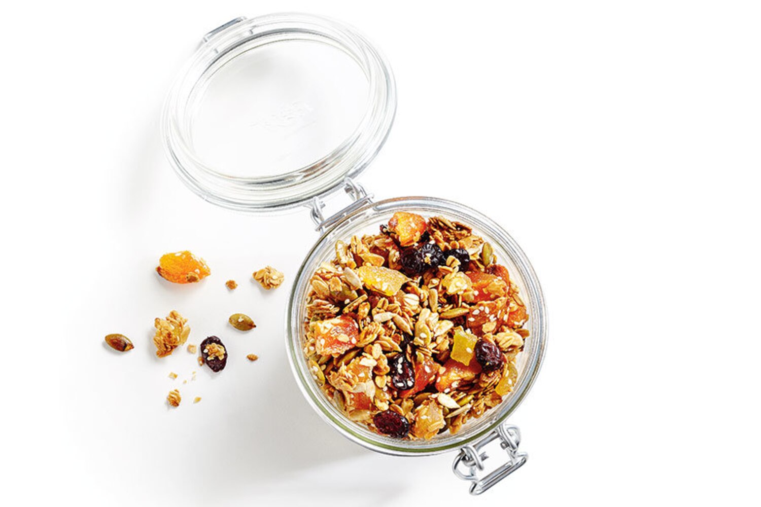 Warm ginger and wasabi add warmth to this savoury and sweet granola. Think of this as a milder version of wasabi peas—perfect for snacking!