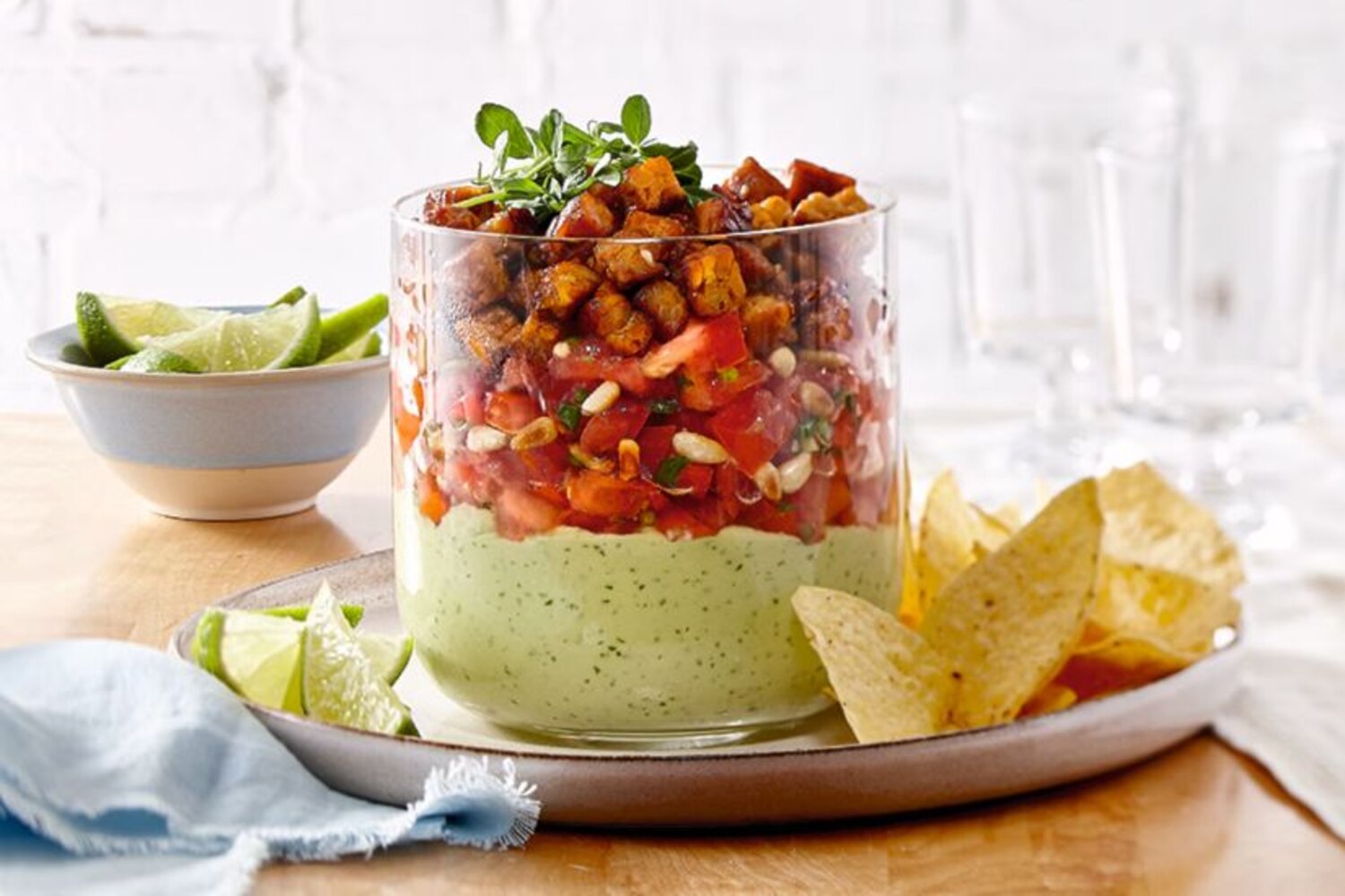 Vegan Guacamole, Salsa & Tempeh Layered Dip