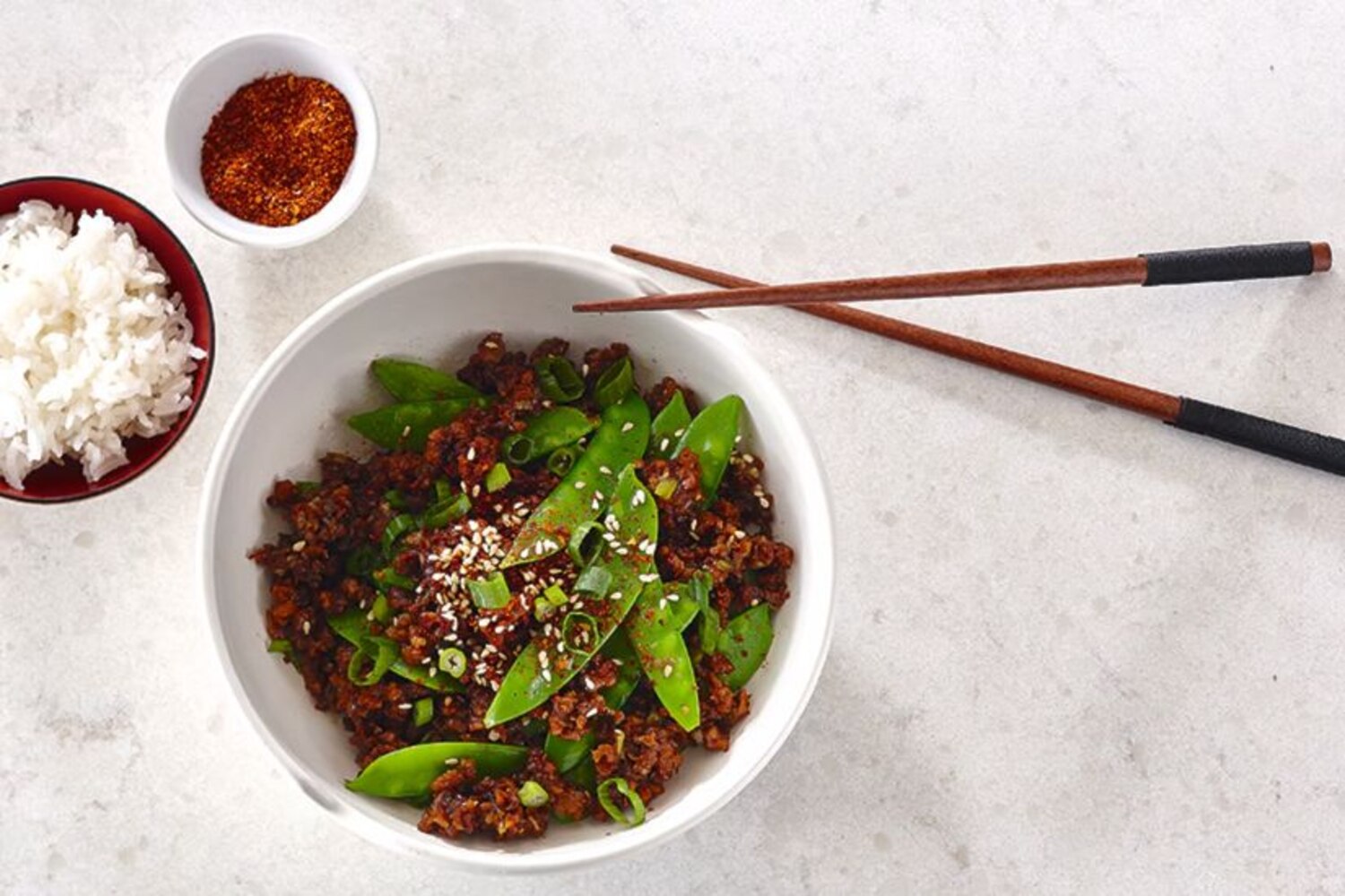 This recipe is inspired by bulgogi, a Korean specialty made with beef marinated in soy sauce, sugar, sesame oil, garlic and ginger. Ours is a vegan version, with the meat swapped out for plant-based protein.