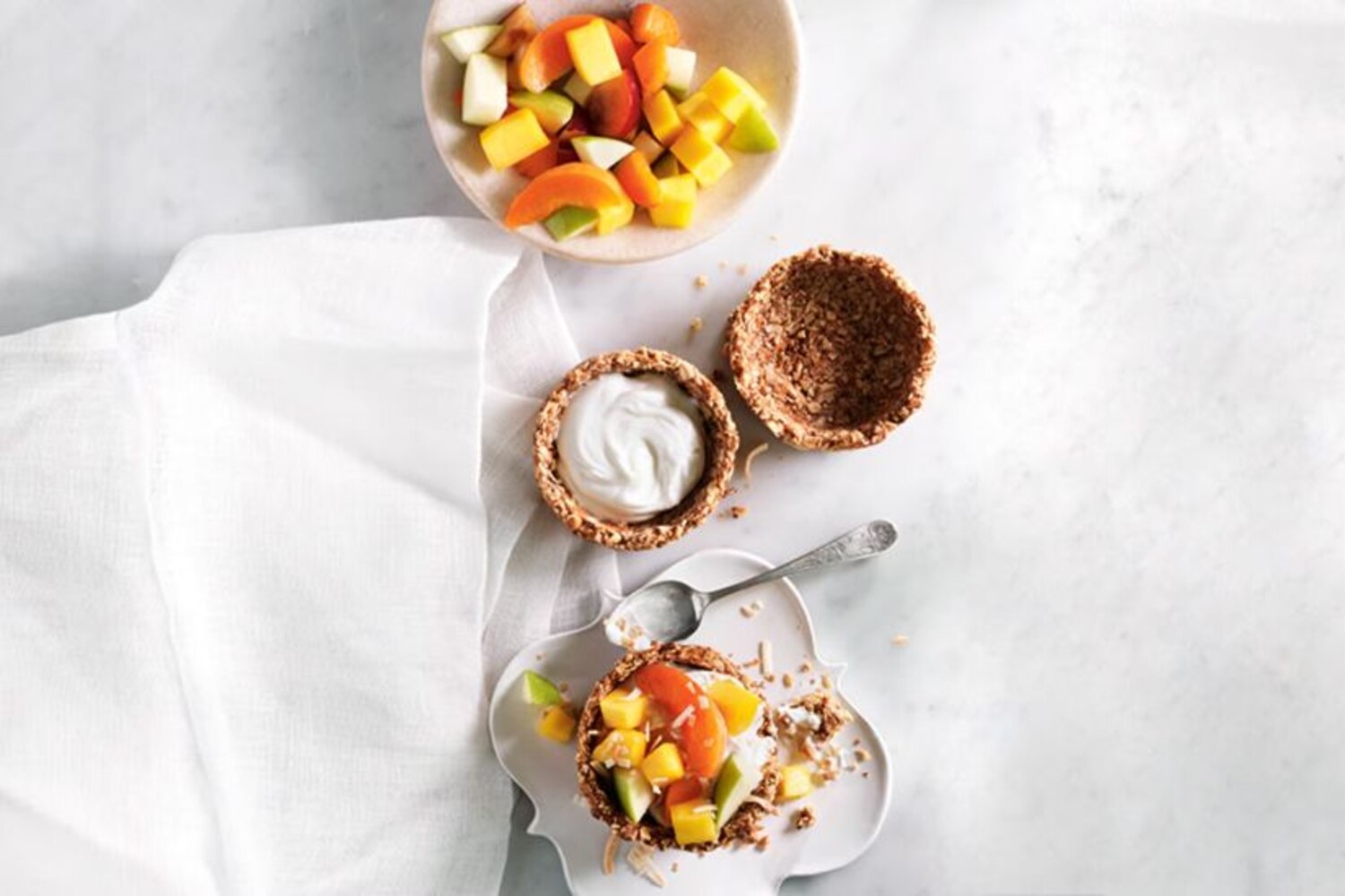 Serve these crunchy granola bowls filled with your favourite coconut yogurt, fresh fruit and a drizzle of maple syrup.