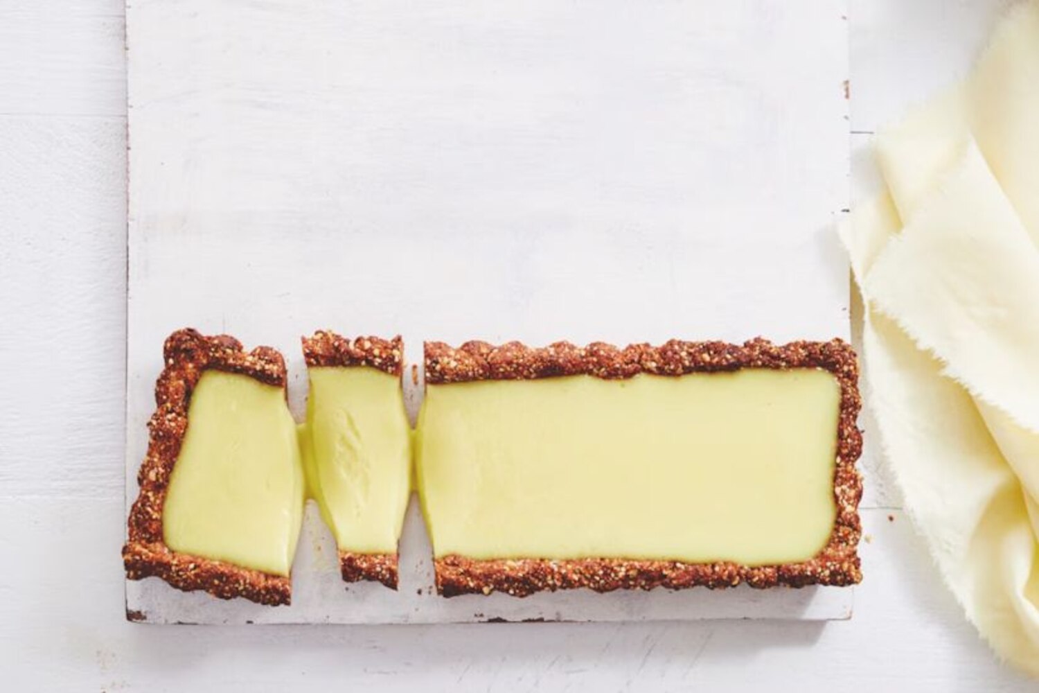 A creamy lemon-coconut filling is wrapped in a nutty gluten-free crust in this recipe.