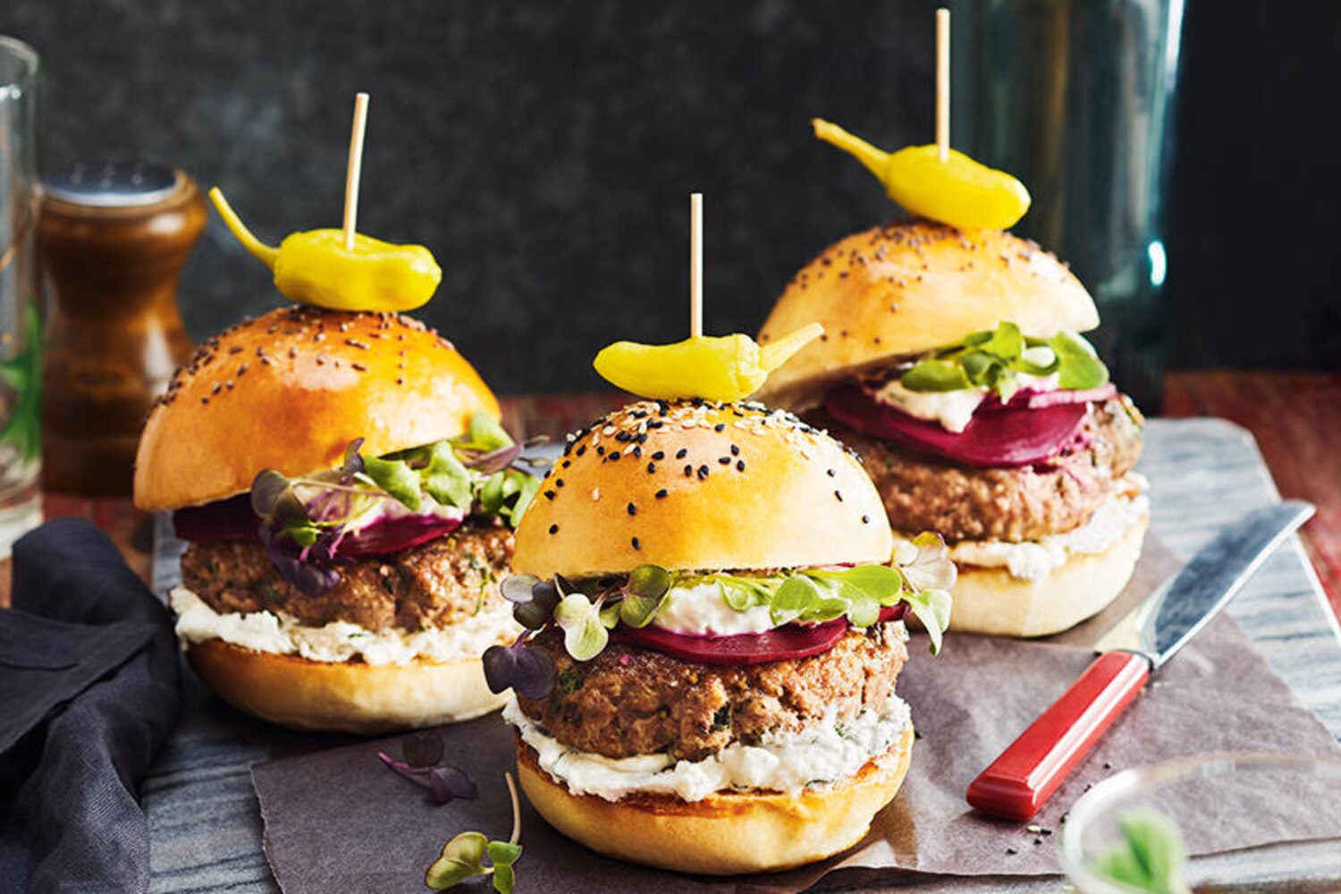 Boost burgers with the intense, delicious flavours of the Middle East. Pomegranate molasses, also called grenadine molasses, is found in Middle Eastern or specialty grocery stores. Its thick texture and sweettart flavour make it an ideal glaze for these burgers.