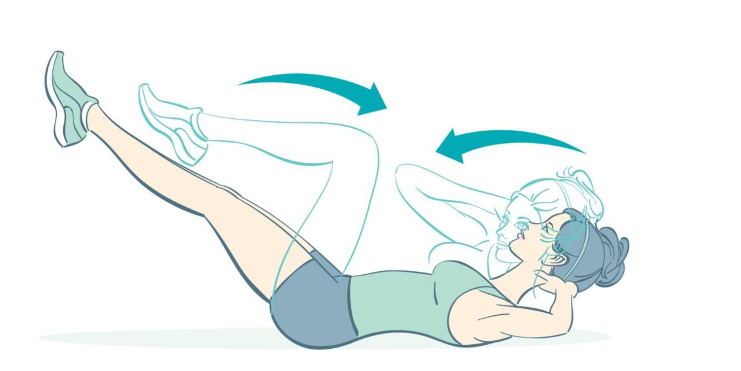 Lie on your back with your hands clasped behind your head, your knees bent and your feet lifted off the floor. Extend your right leg and reach your right elbow toward your left knee. Change to the opposite side, extending your left leg and reaching your left elbow toward your right knee. Continue changing sides, cycling your legs as if you’re on a stationary bike and always reaching your elbow toward the opposite knee. Modification: Any lie-down ab exercises, such as scissors or ticktocks (lift your legs straight toward the ceiling and move them in a circular motion, keeping your torso stable). Focus: Abdominal muscles Reps: Start with 20 reps and work up to 30. Tip: Every time you exhale during a move, contract your abs as much as possible. Always protect your lower back—if it hurts, try a different position.