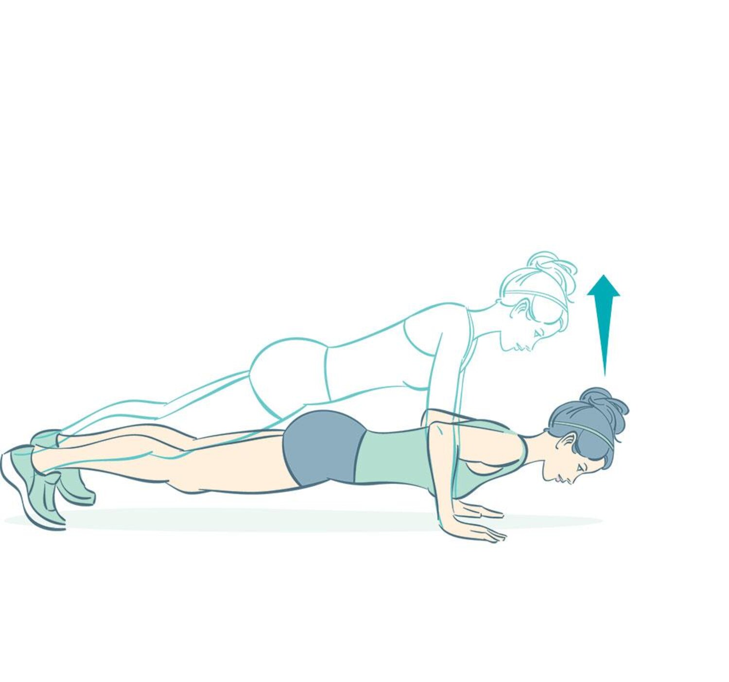 With your hands and feet on the floor, your arms parallel and shoulder-width apart, and your legs straight behind you, lower your body toward the floor (keeping your arms at your sides), then push up to return to a plank position. Repeat. Modification: Hold a plank position with your arms straight and shoulder-width apart. Focus: Chest, shoulders, triceps and abs. Reps: Do as many as you can with good technique. Tip: If you do pushups on your knees, you won’t engage your core. If you can’t lower your body all the way down in standard pushup form, Horton recommends doing a half or mini pushup instead.