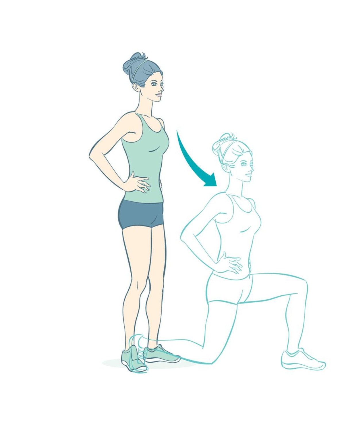 From standing with your legs together, step your right leg forward until both legs are bent at 90-degree angles, making sure your front knee doesn’t extend past your ankle and keeping the weight on the right leg. Push off your right leg to return to starting position. Repeat on your left side. Modification: Squats, plie? squats, step-back lunges, or squats and lunges holding dumbbells Focus: Leg muscles Reps: Start with 20 reps and work up to 30. Tip: For a more advanced workout, perform the exercise plyometrically by incorporating jumps into the lunges.