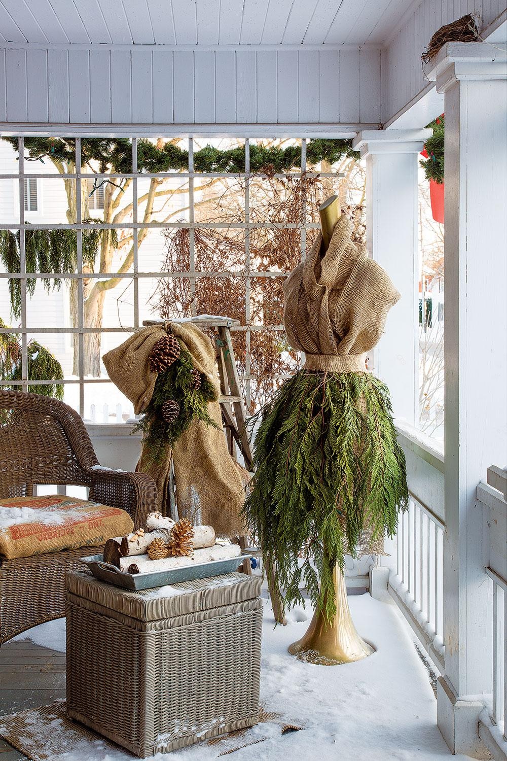 Guests receive a warm welcome from this stylish sentinel—a made-over mannequin that Bertelsen lifted from decidedly unglamorous surroundings. “I found it in the garbage,” she laughs. “There are two of them, actually, and I normally put them on either side of my living room entrance on Oscar night as big gold statuettes.” This year, however, she dressed one in swathes of burlap, cinching the waist with tightly knotted rope. To finish the festive ensemble, she tucked cedar boughs under the rope, which she then covered with a length of burlap ribbon.