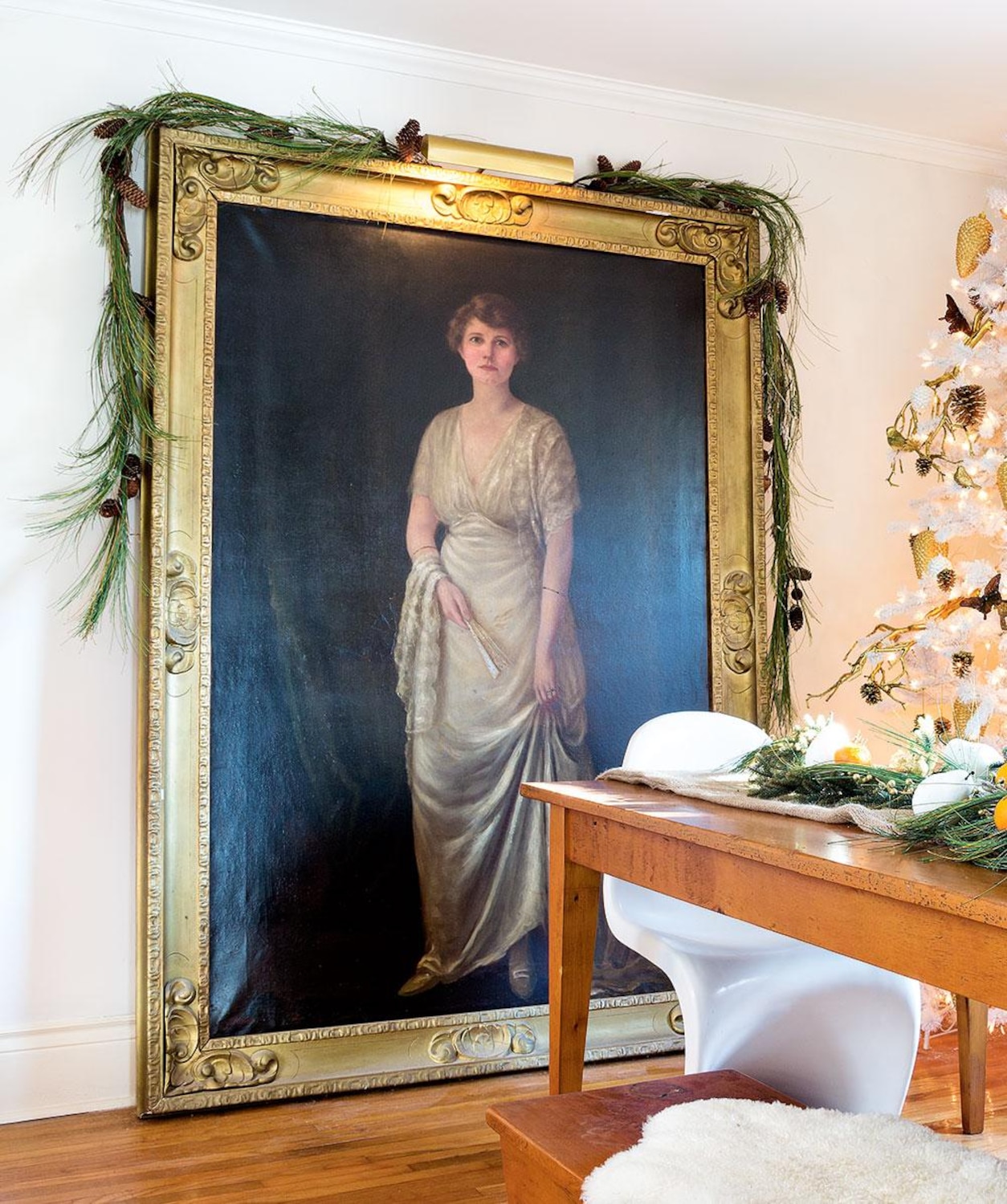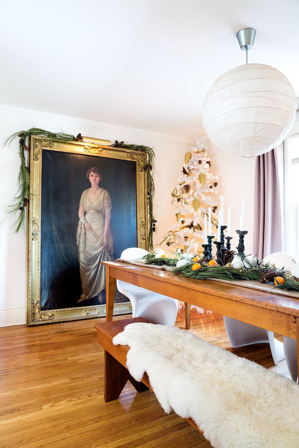 Bertelsen’s home dates back to the 19th century, so it was only natural for her to take a few decorating cues from Christmases past—particularly when it came to dressing her dining table. “I wanted to do Downton Abbey— what they would’ve had in the kitchen, not the upstairs,” she says. That translated into period-appropriate decorations such as the zinc candelabra, pinecones and oranges (“Though they never would’ve had that many oranges—or sparkly pears—back then,” she laughs).
